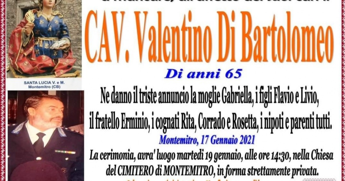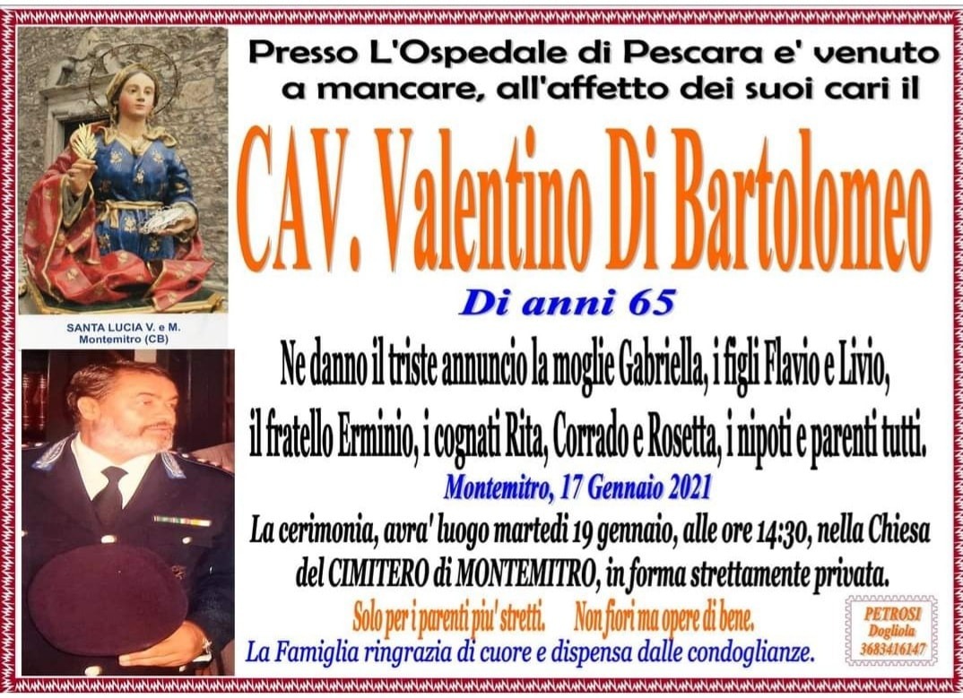 Saranno celebrati domani i funerali del Cavaliere Valentino Di Bartolomeo, ex commissario capo della polizia penitenziaria, prima di Pescara e poi di Chieti. La cerimonia, in forma strettamente privata, si terrà domani, martedì 19 gennaio alle 14.30, nella Chiesa del cimitero di Montemitro, in provincia di Campobasso, dove nacque 65 anni, prima di trasfersi in Abruzzo per motivi lavorativi.