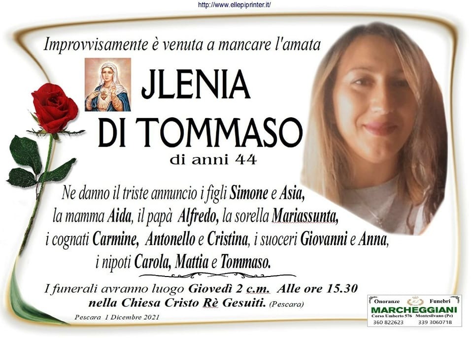 Si svolgeranno domani, giovedì 2 dicembre, alle 15.30 nella Chiesa Parrocchiale Cristo Re ai Gesuiti, i funerali della sfortunata Jlenia Di Tommaso. La 44enne, madre di due figli, era stata trovata purtroppo priva di vita da un passante nei pressi dei portici in via Paolini, di fronte al Covid Hospital, venerdì mattina 26 novembre. A nulla sono valsi i tentativi di soccorso da parte dei sanitari del 118 giunti sul posto dopo pochissimi istanti. Un infarto ha strappato agli affetti dei suoi cari la giovane madre. Dopo l'esame autoptico condotto dall'anatomo patologo Christian D'Ovidio, il corpo è stato restituito alla famiglia. La camera ardente è stata allestita presso l'Obitorio dell'ospedale Civile di Pescara dove in tanti si stanno recando per portare l'ultimo saluto. La redazione tutta rinnova la vicinanza ai figli Simone e Asia, a mamma Aida e papà Alfredo e alla sorella Mariassunta.