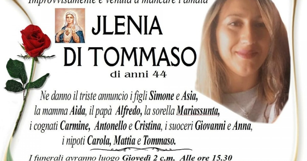 Domani l'ultimo saluto a Jlenia Di Tommaso, la giovane mamma stroncata da infarto venerdì mattina