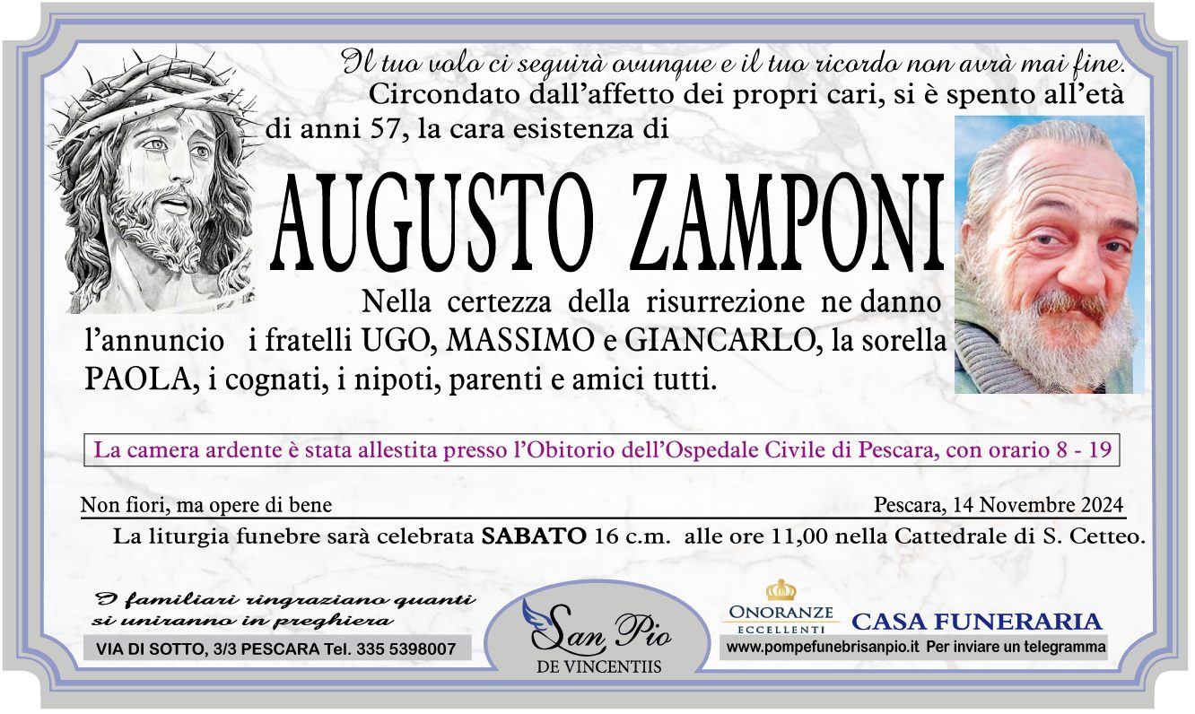 Saranno celebrati domani, sabato 16 novembre alle ore 11.00, nella cattedrale di San Cetteo a Pescara i funerali di Augusto Zamponi, il senzatetto di 57 anni morto all’alba di lunedì proprio sui gradini della cattedrale. Saranno i familiari di Zamponi con l'aiuto della parrocchia a sostenere le spese del servizio funebre e non il Comune di Pescara come era stato annunciato in precedenza.