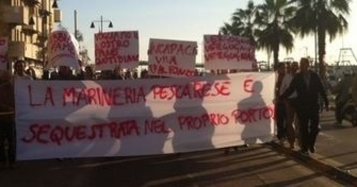 QUEL CARTELLO PRO LUCIANO. Forse lo smacco più grande (oltre il pesce gettato davanti al Comune), questa mattina, gli amministratori di Pescara l'hanno ricevuto da quel cartello, che campeggiava impietoso tra i marinai durante la protesta attuata per chiedere l'immediato dragaggio del porto. E a poco serviranno le solite dichiarazioni di intenti e i consueti attestati di solidarietà che oggi pomeriggio arriveranno sicuramente da Palazzo di Città. Quando ti trovi di fronte una scritta che reca la frase "Fannulloni, incapaci, viva D'Alfonso", riferita ovviamente all'ex sindaco "Big" Luciano, significa che hai fallito o che quantomeno il tuo lavoro non è stato apprezzato dai diretti interessati. Perchè è di questo che stiamo parlando: la marineria pescarese si sente "in lutto" e chiede risposte alle istituzioni. Oggi i pescatori hanno sfilato dal porto verso piazza Italia, per arrivare al palazzo della Prefettura e della Provincia e a quello del Comune, chiedendo che il dragaggio del porto cominci nel più breve tempo possibile, considerato che tutto è bloccato dal mese di febbraio - a causa dei fondali insabbiati - e che da mesi la stessa marineria non percepisce, giocoforza, un euro.