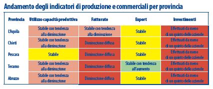 IL CASO DELL'ABRUZZO. In un simile scenario, l’Abruzzo si caratterizza per un ulteriore saldo negativo di 305 tra iscrizioni e cessazioni di aziende manifatturiere nelle Camere di commercio delle quattro province. A ciò si associa un tasso di disoccupazione tornato a crescere (+3% nel secondotrimestre del 2012 rispetto al corrispondente periodo dell’anno precedente) ed un aumento del numero di ore di Cassa Integrazione Guadagni ordinaria e Straordinaria. In un simile pesante contesto economico la situazione viene ulteriormente peggiorata dal calo delle esportazioni (-4,8% rispetto al I semestre del 2011), dato in totale controtendenza rispetto al valore nazionale ed a quello del mezzogiorno. Sul piano dell’innovazione, si registra una tendenziale tenuta dell’inversione di tendenza nelle richieste di brevetti presentate al sistema camerale regionale che crescono di poco più del 18%.