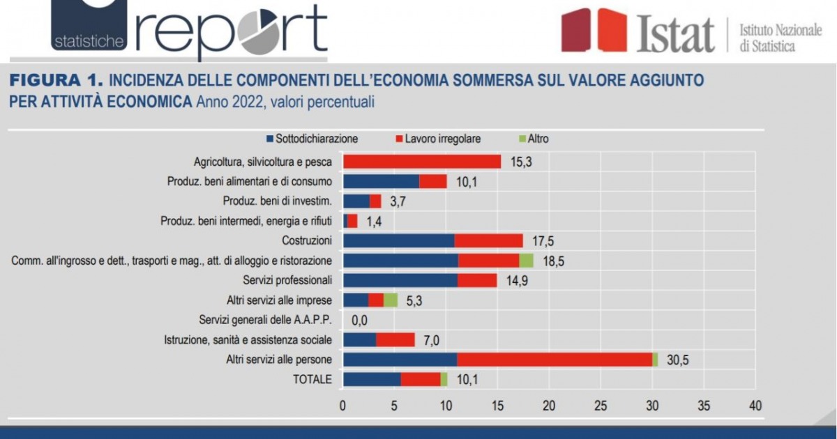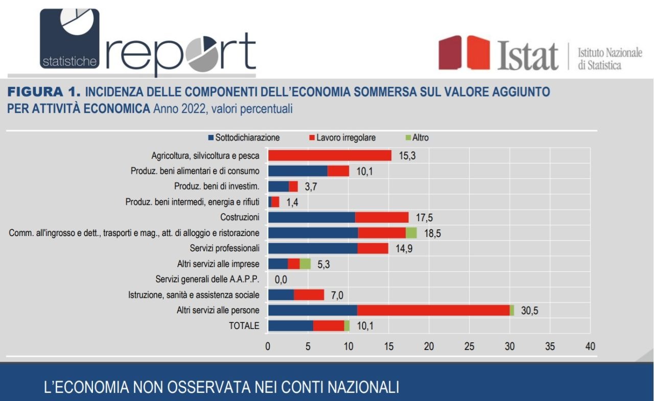 Secondo l’Istat, che ha sviluppato il dato sull’economia non osservata dei conti nazionali, la crescita rispetto al 2021 é del 9,6%