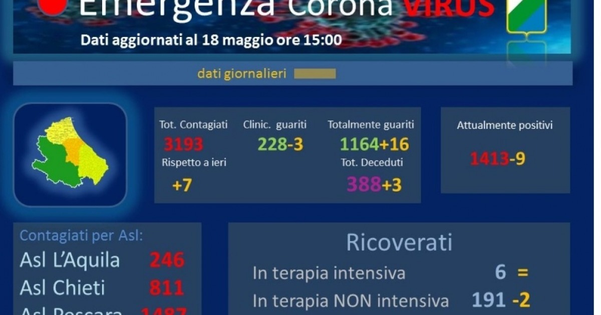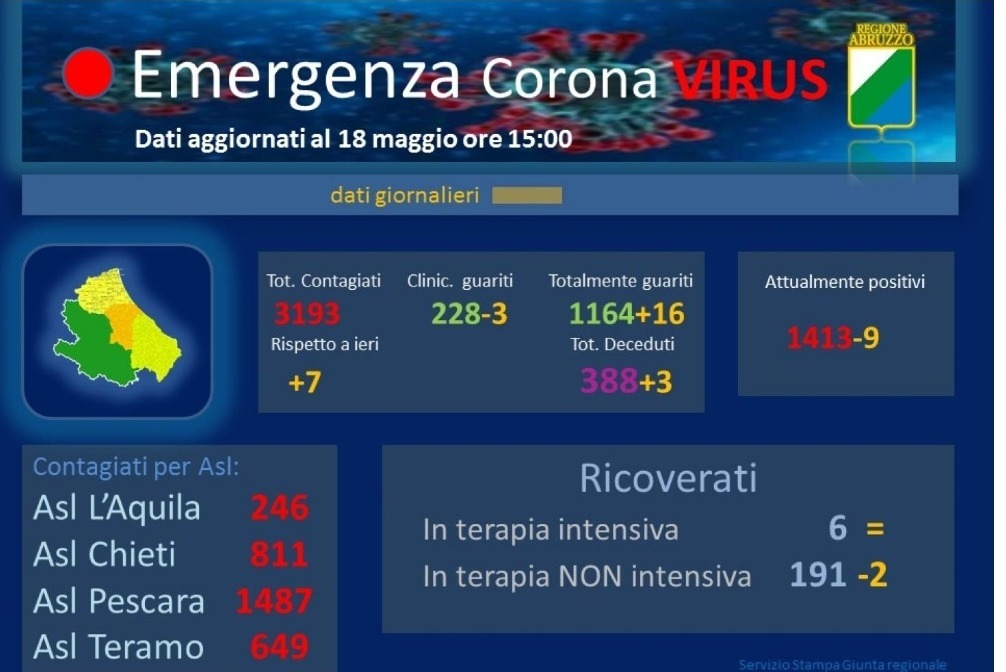 LE PREVISIONI DEGLI ESPERTI. Aaprile gli esperti dell'Osservatorio per la Salute delle Regioni Italiane indicarono per l'Abruzzo il 7 maggio quale data a contagio zero. Una previsione che si è rivelata errata di undici giorni, ma quella di oggi nonostante i nuovi positivi (+7 rispetto a ieri, totale 3193) verrà ricordata come simbolo della lotta contro la malattia. Naturalemente guai ad abbassare la guardia perché il virus non è scomparso come ci dimostra il focolaio che si è creato a Vasto tra alcune persone che avevano partecipato a un funerale in Molise.