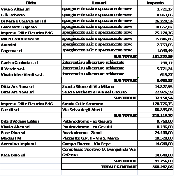 Inoltre sono state deliberate le somme urgenze per le ditte che hanno operato per lo spargimento sale e spazzamento neve.