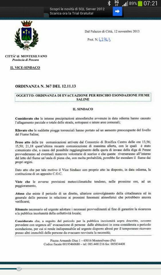 Il fiume Saline esondato. Trenta famiglie evacuate nella zona artigianale e molte le abitazioni isolate. E' questo il bilancio dell'ondata di maltempo che sta flagellando l'Abruzzo. Ma i problemi provocati da Venere, la perturbazione che sta flagellando l'Abruzzo costiero, si spostano invevitabilmente a Palazzo Baldoni.