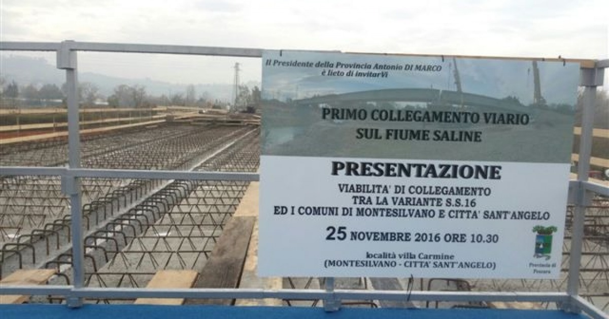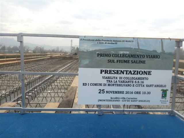FINALMENTE MONTESIVANO E CITTA' SANT'ANGELO UNITE DAL PONTE. Il primo dei tre ponti, in località villa Carmine, che collegherà via Tamigi a contrada San Martino di Città Sant’Angelo è terminato e verrà messo in servizio nei primi mesi del 2017. Questa mattina, alla presenza del presidente della Regione Luciano D’Alfonso, del Sindaco e vicesindaco di Montesilvano Francesco Maragno e Valter Cozzi, del vicesindaco e del Presidente del Consiglio Comunale di Città S. Angelo, Alice Fabbiani e Franco Galli, dell’ex presidente e attuale consigliere provinciale Guerino Testa, dei tecnici guidati dal dirigente Paolo D’Incecco e delle maestranze della ditta esecutrice, è stato tagliato il nastro che inaugura la fine della costruzione. Presente anche il Presidente della Provincia di Biella e Presidente dell’UPI piemontese, Emanuele Ranella, giunto a Pescara per il convegno sull’Area vasta in programma nel pomeriggio in Provincia.