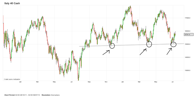 TIENE L'INDICE FTSE MIB. Il nostro indice il FTSE MIB invece, ha tenuto il supporto a 15000, sono tre volte che rimbalza su questo livello. Risulta fondamentale a questo punto la tenuta di tale area, una chiusura dell’ indice sotto i 14800 punti, implicherebbe una correzione importante mettendo di nuovo a rischio il trend di medio periodo. Il sereno almeno per il breve periodo dovrebbe tornare con una chiusura sopra i 16300 punti. Non credo che il mercato tarderà a darci segnali operativi per farci capire quale direzione voglia prendere nei prossimi giorni.