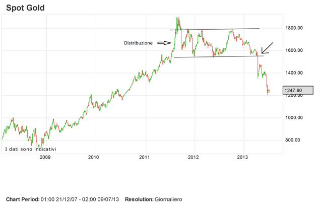 IL MERCATO DELL'ORO IN RIBASSO. Anche sul gold si è visto un ribasso importante, partito questo però nel mese di aprile. Ricordo ancora alcuni mesi fa i target “ambiziosi” dati da analisti e banche d’affari sul metallo giallo; puntualmente invece è arrivato, con la rottura del supporto fondamentale a 1550, un clamoroso sell off che ha riportato le quotazioni in area 1240.