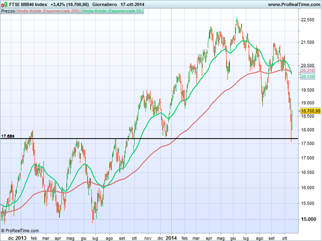 Siamo venuti giu fino a 17500 punti minimo intraday raggiunto nella giornata di giovedi. L’area dei 18000-17500 da dove infatti il mercato ha rimbalzato per me è un area di supporto fortissima. Il mercato vi ha tradato quasi un anno, corrisponde ai massimi del 2013 e da dove è partito il rally del ftse mib. Venerdi, infatti, dopo un minimo intraday a 17500 segnato il giorno prima, il mercato ha chiuso in forte rialzo sui massimi a 18700. Solo infatti una ripartenza violenta, cosiddetta a V ,eviterebbe ulteriori affondi ribassisti. Per chi non lo ha già fatto, per me quindi su questi livelli c’è un’ottimo rapporto rischio-rendimento per un eventuale acquisto e rientrata sul mercato. La stop scatterebbe subito sotto i minimi segnati giovedi sulla rottura dei quali potremmo assistere a nuove giornate di forti cali. C’è da capire se questi sono livelli per ricostruire posizioni long per il medio-lungo periodo oppure se il rimbalzo sarà un’opportunità per vendere. Andremo incontro a giornate e settimane di forte volatilità ma penso che se questi livelli reggeranno potremmo tornare a vedere i massimi di mercato nei prossimi mesi.