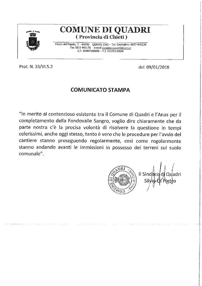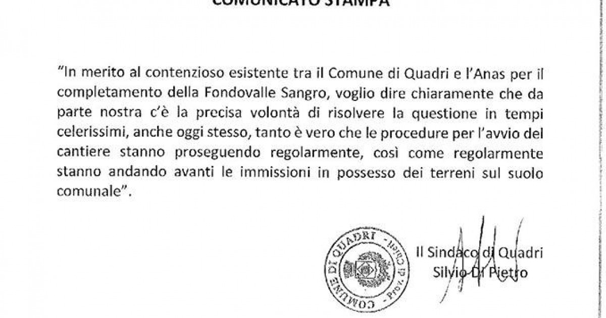 FONDOVALLE SANGRO: FIRMATO IL MEGA APPALTO DA 190MILIONI TRA ANAS E DE SANCTIS COSTRUZIONI. Il contratto tra l'Anas e la De Sanctis Costruzioni per il completamento della Fondovalle Sangro verrà firmato entro il 15 gennaio. E' quanto stabilito stamattina insieme al presidente di Anas Gianni Armani dopo aver verificato che il contenzioso esistente tra il Comune di Quadri e l'azienda pubblica delle strade verrà composto bonariamente. Il sindaco di Quadri, Silvio Di Pietro, lo ha ufficializzato oggi.