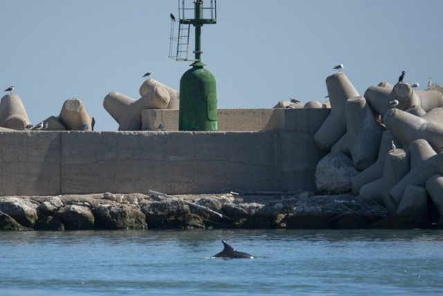 Ieri mattina le osservazioni dei tanti uccelli che correvano sulla battigia sono state distratte però dalla inconsueta osservazione di due delfini che nuotavano all’ interno del Porto dalle foto, scattate da Marco Sborgia, è stato possibile facilmente identificarne la specie, si tratta di due Tursiopi adulti sicuramente in attività di ricerca e cattura di pesci.