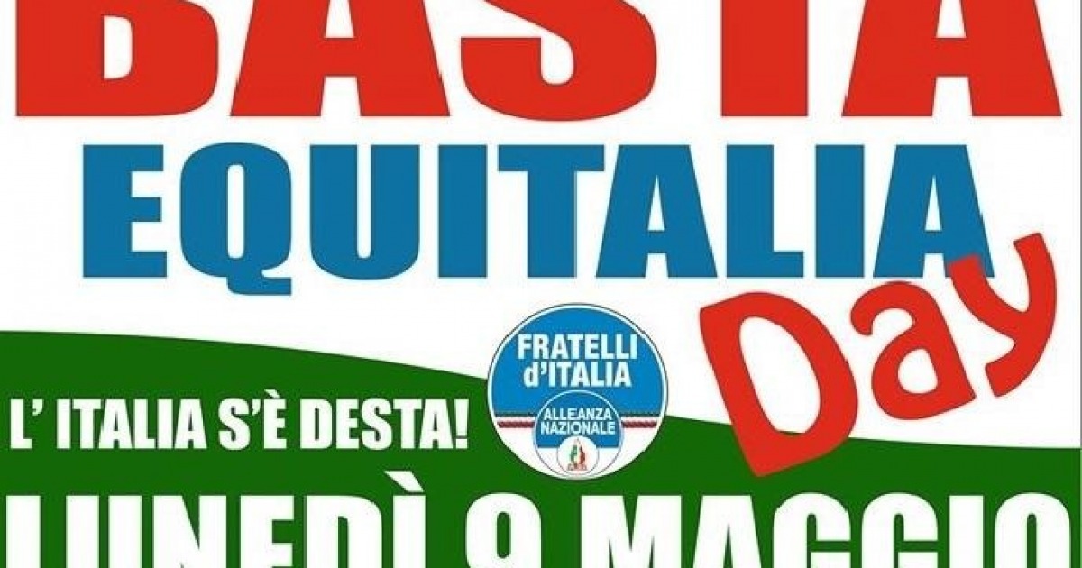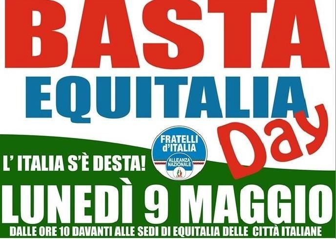 BASTA EQUITALIA DAY. Fratelli d’Italia – Alleanza nazionale si schiera dalla parte dei cittadini italiani promuovendo una manifestazione a carattere nazionale, “Basta Equitalia Day”, che si terrà lunedì 9 maggio davanti alle sedi della società, a totale capitale pubblico, più temuta in Italia. Sconfiggere Equitalia, per Fd’I-An, è diventato “un obiettivo possibile”, e pertanto non si può più permettere che quest'ultima “mieta altre vittime tra i nostri connazionali”.