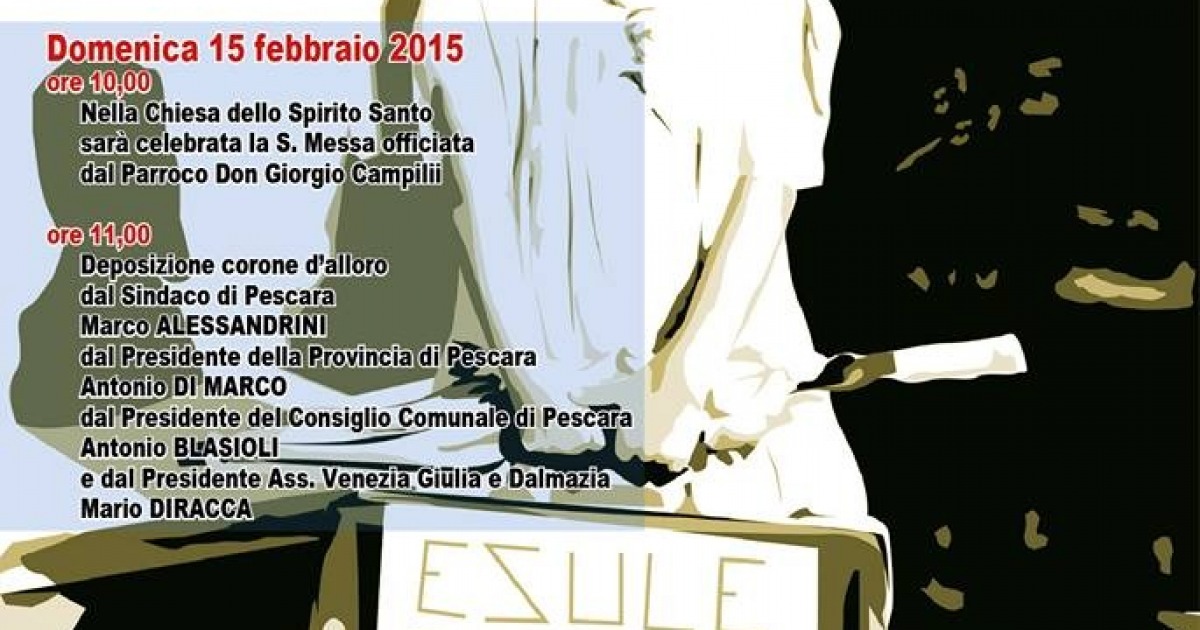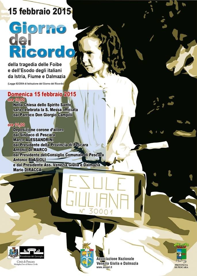 PESCARA CELEBRA IL GIORNO DEL RICORDO. Il giorno del ricordo avrà due momenti di celebrazione da parte dell'Amministrazione comunale di Pescara, che dedica alla memoria una particolare attenzione. Dopo la Shoah e il tributo a personaggi e giornate che hanno segnato la storia e le coscienze della città e della comunità, Pescara si prepara a celebrare anche la giornata dedicata alla memoria delle Foibe. Due gli appuntamenti previsti dalla Presidenza del Consiglio Comunale, di concerto con Provincia e Associazione Venezia Giulia e Dalmazia che coltiva con diversi eventi la memoria dell'esodo e della morte di moltissimi italiani nell'immediato dopoguerra.