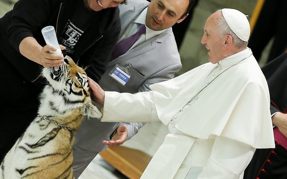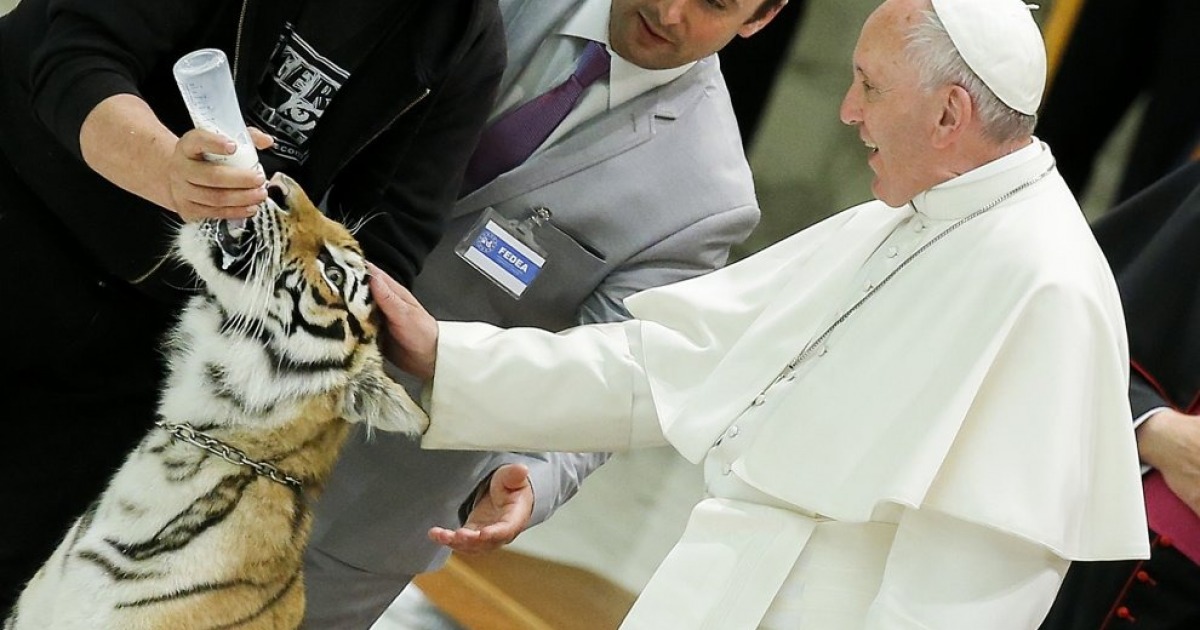 PAPA BERGOGLIO E LA TIGRE IN CATENE. Il Papa è tornato a parlare di animali, ancora una volta nel modo sbagliato. Dopo averci fatto ben sperare nel 2014, quando ha dichiarato che anche gli animali vanno in paradiso, il pontefice ha fatto un pericoloso scivolone distinguendo l’amore per gli animali da quello per gli altri esseri umani, attirando le critiche di tutte le persone che ogni giorno lottano per dare pari dignità a tutti gli esseri viventi.