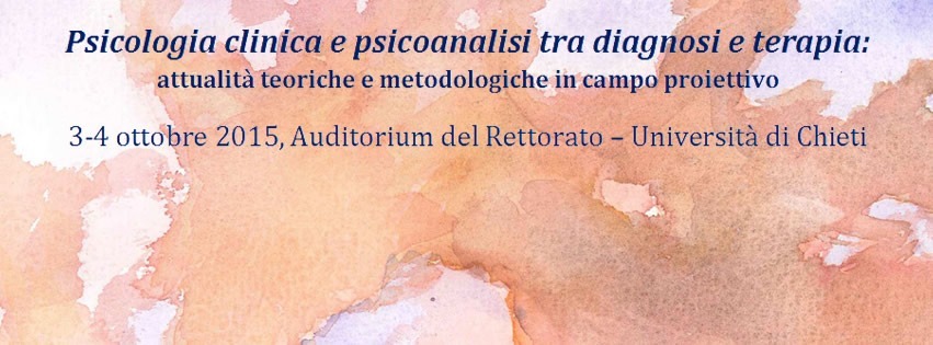 IL 3 E 4 OTTOBRE CONVEGNO INTERNAZIONALE RORSCHACH ALLA D'ANNUNZIO. L’Associazione Italiana Rorschach, associazione psicologico-scientifica a carattere nazionale, finalizzata allo studio e alla ricerca clinica dei Metodi Proiettivi, il 3 e 4 ottobre p.v., nell’Auditorium del Rettorato dell’Università di Chieti, terrà un Convegno di Psicologia dal tema “Psicologia Clinica e psicoanalisi tra diagnosi e terapia: attualità teoriche e metodologiche in campo proiettivo”. Il Convegno di rilievo internazionale data la presenza di colleghi stranieri, intende offrire uno spazio di riflessione clinica sull’attualità della diagnosi psicologica e della funzione che essa esercita oggi nel contesto della Psicologia Clinica e in quello più specifico della cura psicoterapeutica. Presidente del Convegno è Tiziana Sola, presidente dell’Ass. It. Rorschach, professore a contratto dell’Università di Chieti e psicoanalista. Ospiti internazionali: C. Chabert, B. Verdon, J.-Y. Chagnon dell’Università di Parigi. Ospiti nazionali: D. Passi Tognazzo, M. Armezzani, L. Bruno dell’Università di Padova; C. Mento e S. Settineri dell’Università di Messina; C. Schinaia, psicoanalista SPI di Genova, P. Capri e M. Saccà dell’Ass. It. Psicologia Giuridica di Roma, G. Gandino dell’Università di Torino. Vi sarà la presenza del Presidente dell’Ordine Psicologi Abruzzo, T. Di Iullo e del Consiglio Nazionale Psicologi, F. Giardina. Moderatori e discussant : M. Di Giannantonio, F.M. Ferro, M. Fulcheri, L. Grignoli, M.C. Verrocchio. Per informazioni: www.associazioneitalianarorschach.it ; E-mail: info@psicodiagnosiclinica.it ; tel. 085.4225083 – cell. 333.3454595.