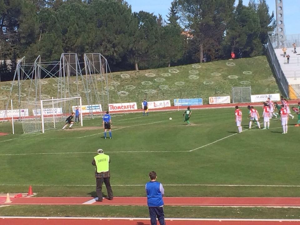 SECONDO TEMPO. Dopo due buone occasioni per i marchigiani al 18° i neroverdi pareggiano dopo una lunga percussione con Broso che porta in parità i suoi colori. Dal 26° i neroverdi giocano in 10 per l'espulsione di Di Pietro che colpisce in piena area volontariamente Bartolini. Kouko, incaricato del tiro, calcia sopra la traversa. Al 40° è Croce a sorvolare la traversa con un calcio da fermo. Pur in inferiorità numerica la compagine ospite in maglia neroverde riesce a bloccare il risultato in parità.