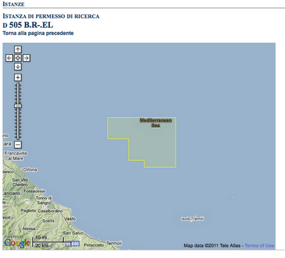 IL RUOLO DEI CITTADINI. Nell'ultimo testo, quello del 2011 del Ministero dell'Ambiente, al quale i cittadini avevano inviato osservazioni di contrarietà in gran numero si afferma invece che: " Le osservazioni pervenute si riferiscono già agli eventuali impatti generati dall'attività di prospezione sismica con la tecnica dell'airgun, per i quali la commissione tecnica di verifica dell'impatto ambientale VIA/VAS ha previsto misure di prevenzione e mitigazione nel quadro prescrittivo......". Il decreto portava la firma di Giancarlo Galan e di Stefania Prestigiacomo. Ancora una volta, ad accorgersi di queste notizie e a sollevare osservazioni, furono i cittadini di buona volontà e non le autorità pagate apposta per tutelarci e proteggerci. Questa è l'area di indagine della ditta Petroceltic al largo della costa vastese - molisana