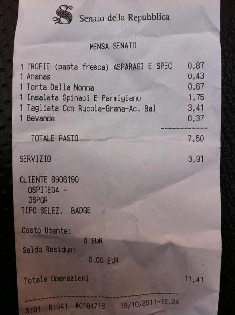 UNA TAGLIATA CON RUCOLA A 3,41 EURO, DOVE? NATURALMENTE IN SENATO. Non stiamo parlando dell'ultima offerta di Lidl nè del cut price di un ristorante discount. Qui si parla della mensa del Senato della Repubblica dove un pasto completissimo (primo, secondo, frutta, dolce e bevande) costa solo 11,41 euro.