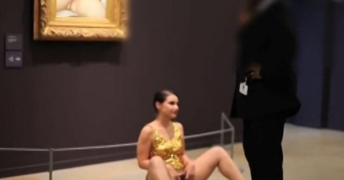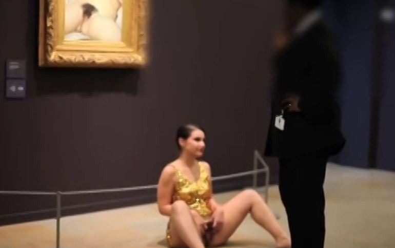 Sulle note dell'Ave Maria di Schubert davanti all'Origine du Monde di Gustave Courbet l'artista apre le gambe e mostra il proprio sesso agli astanti ed alla telecamera