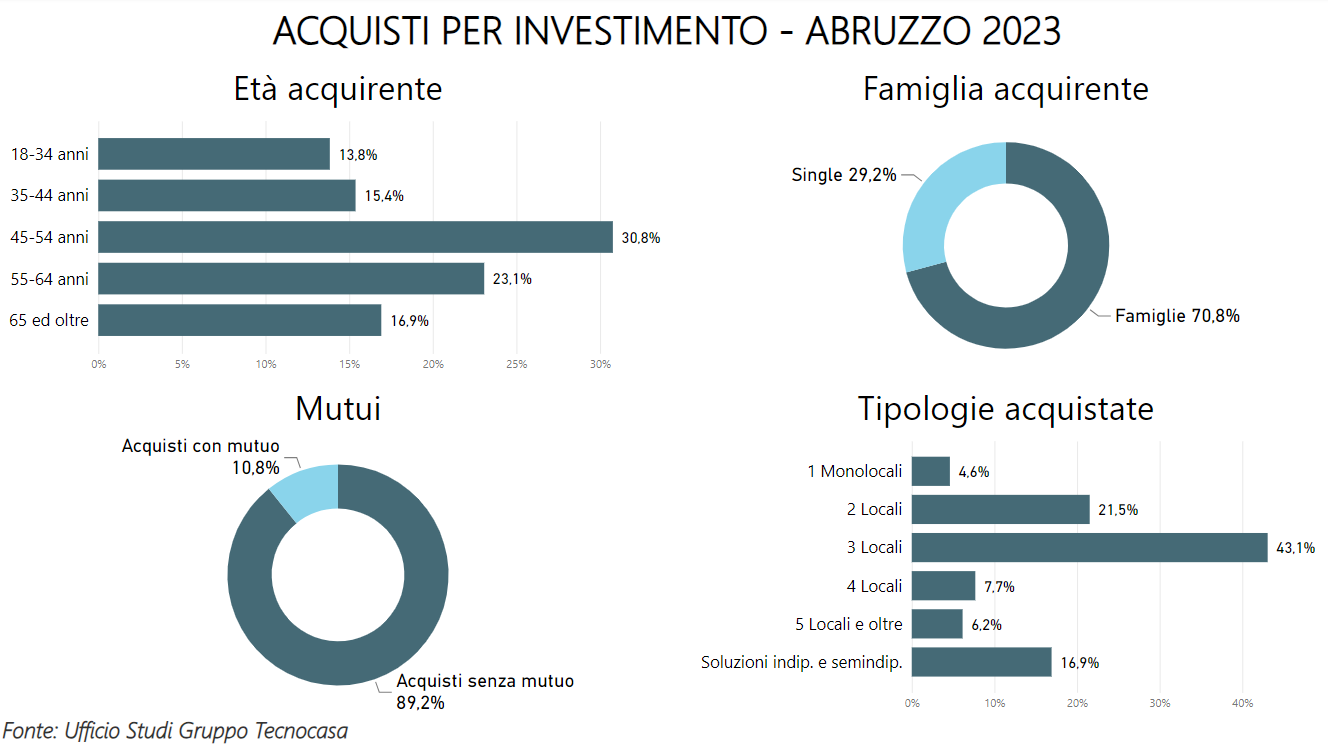 L’Ufficio Studi del Gruppo Tecnocasa ha analizzato le compravendite realizzate in Abruzzo attraverso le agenzie attive in regione nel 2023. Obiettivo della ricerca è quello di evidenziare il motivo dell’acquisto delle abitazioni ed analizzare caratteristiche e scelte di chi compra per investimento.