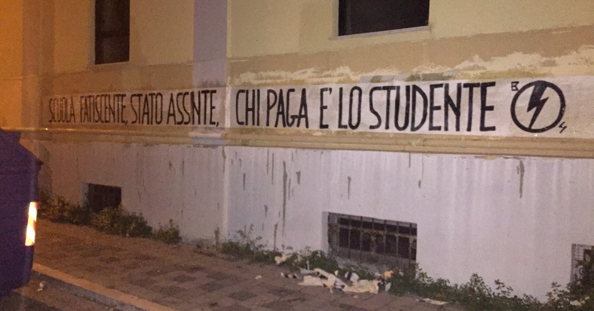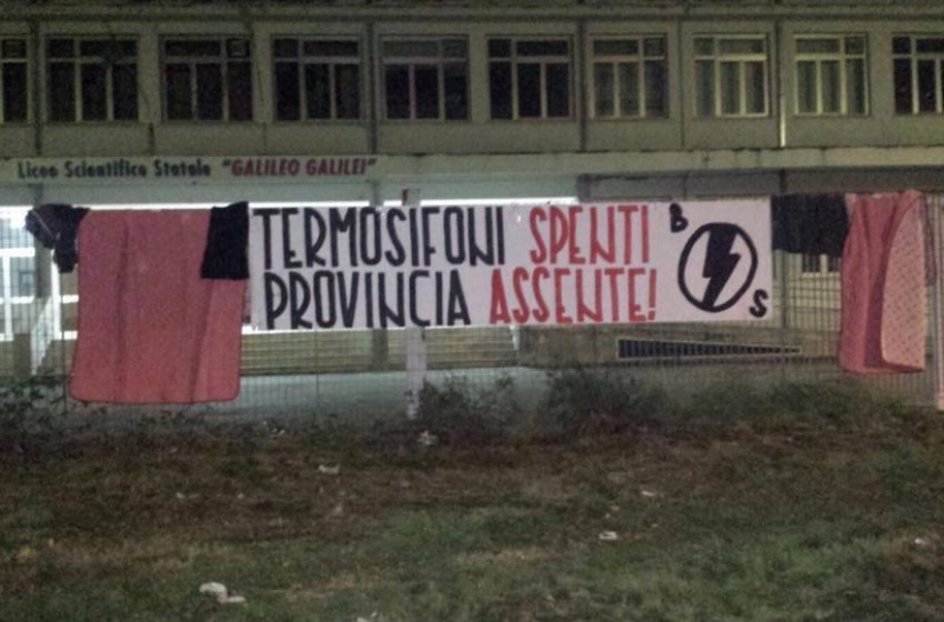 Uno striscione di protesta degli studenti sul muro della struttura scolastica: "Mancano all'appello 730mila euro dal Ministero. Perchè?"
