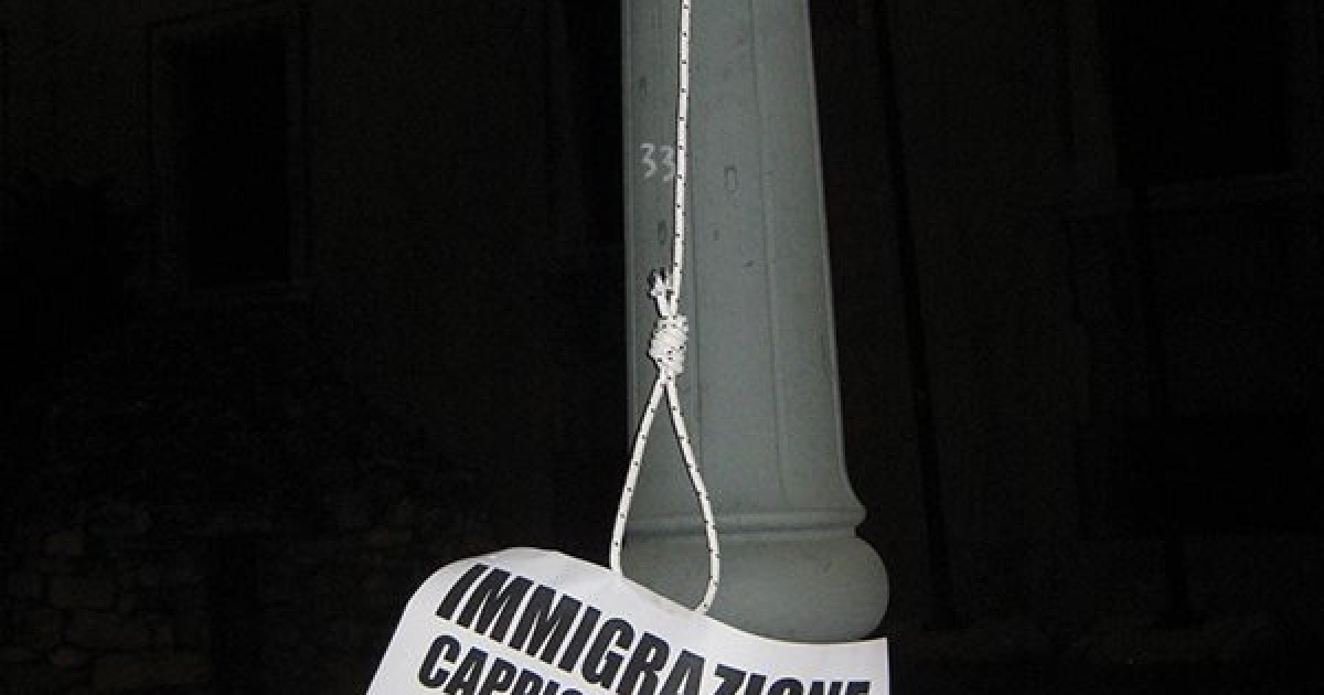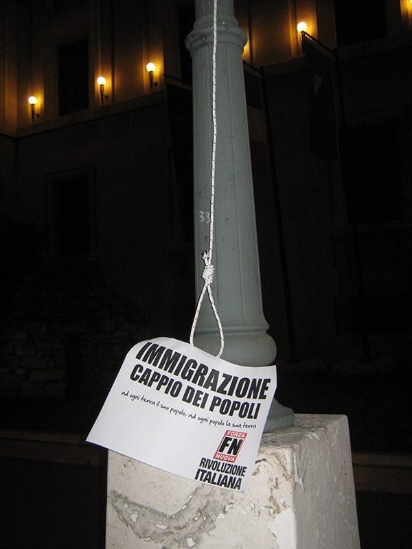 FORZA NUOVA: ENNESIMA PROTESTA CHOC CONTRO L'IMMIGRAZIONE. Dopo la protesta dello Ius Soli con tanto di bandiera insanguinata e piccone lasciati davanti alla sede del Partito Democratico di Pescara Forza Nuova torna a provocare il Ministro Cécile Kyange, in visita a Pescara per un dibattito sull'emigrazione/immigrazione in Provincia , col solito stile aggressivo. Cappi di corda appesi in diversi punti della città e volantini contenenti la scritta: "Ad ogniterra il suo popolo, ad ogni popolo la sua terra". Solo ieri il Ministro dell'Integrazione del Governo Letta aveva ricevuto la vile offesa del vicepresidente del Senato, Roberto Calderoli, che aveva paragonato le sue sembianze fisiche a quelle di un'orango.