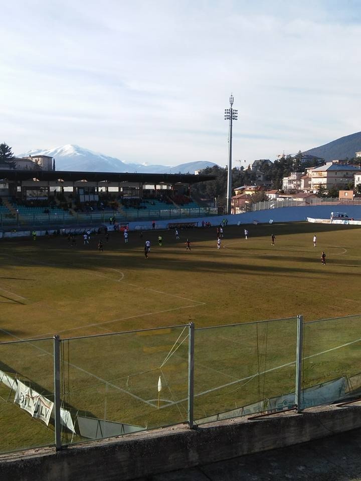 L'AQUILA REGALA UN TEMPO ALL'AREZZO E PAREGGIA AL FATTORI 1-1. Bicchiere mezzo pieno per la squadra aquilana che dopo aver giocato un primo tempo nettamente insufficiente riesce a reagire nella ripresa e a pareggiare una gara dalle tante emozioni. La squadra di Perrone si schiera con l’ormai consueto 3-5-2, con Sandomenico ad agire sulla fascia sinistra e Perna e De Sousa sul fronte d’attacco, con quest’ultimo spesso impegnato in un oscuro lavoro di raccordo con il centrocampo. Dopo i primi minuti di studio si capisce che non sarà una giornata semplice per L’Aquila,contro un Arezzo ben messo in campo e capace di ripartire con efficacia. La difesa rossoblù fatica non poco a controllare gli ottimi Cori, Tremolada e Betancourt. Al 32’ i toscani vanno in vantaggio grazie ad una punizione di Tremolada concessa generosamente dal limite da un insufficiente Maleleo di Casarano. Sulla traiettoria non irresistibile il portiere aquilano Scotti sembra avere qualche responsabilità. L’Aquila subisce il colpo e prova a reagire con una sventola di Besaja da 25 metri sventata in angolo da Baiocco. Al 45’ l’episodio che potrebbe chiudere la gara, quando l’arbitro giudica da rigore un intervento di Sanni ai danni di Betancourt: sul dischetto si presenta Tremolada ma Scotti stavolta è bravissimo a parare in due tempi. Nella ripresa gli uomini di Perrone appaiono trasformati e mettono sotto l’Arezzo, ci provano prima Perna e Sandomenico, poi Perrone compie la mossa che permetterà ai rossoblù di agguantare il pari: richiama De Sousa in panchina per Milicevic e sposta Sandomenico in attacco. Da questo momento è un monologo abruzzese con L’Aquila che spinge e l’Arezzo incapace di uscire dalla sua meta campo. Al 25’ Perna verticalizza il gioco per Sandomenico che si presenta da solo davanti a Baiocco, il bomberino aquilano è freddissimo del dribblare l’estremo difensore ospite e nel depositare in rete. L’Aquila prova a conquistare l’intera posta in palio ma le occasioni degli uomini di Perrone terminano a lato per l’imprecisione di Sandomenico prima e Perna dopo. Termina 1-1 tra gli applausi del Fattori che riconosco alla squadra di avere dato fino all’ultima goccia di sudore in campo. L’Aquila è attesa da una settimana importante con la sentenza sulla vicenda Dirty Soccer, che probabilmente porterà una penalizzazione in classifica, e dalla trasferta di Pontedera nell’anniversario della scomparsa del tifoso rossoblù Nicola Mezzacappa avvenuta il 30 Gennaio 1994 proprio in occasione della trasferta toscana. Due motivi in più per continuare a credere nella salvezza.