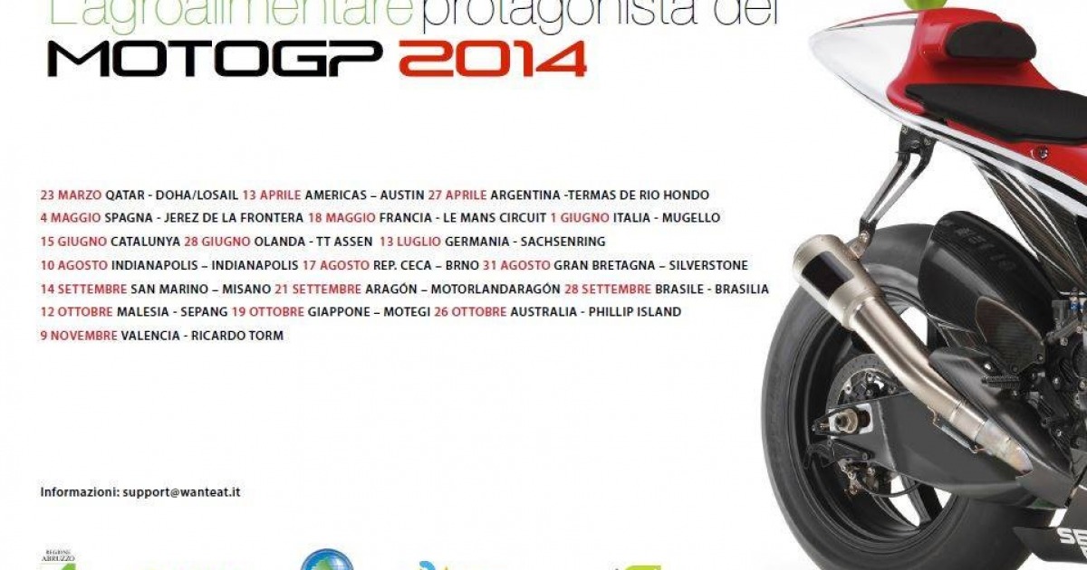 L'AGROALIMENTARE D'ABRUZZO PROTAGONISTA DEL CIRCUS DELLA MOTOGP. Venerdì 17 gennaio 2014, alle ore 10 e 30, presso la Sala Blu della Regione Abruzzo, in viale Bovio a Pescara, verrà presentata l’iniziativa “In Viaggio con WantEat” che offre la possibilità alle aziende della Regione Abruzzo di presentare i propri prodotti in uno dei contesti più emozionanti del mondo sportivo: il Paddock del MotoGp.
