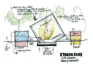 L'IDEA DI RENZO PIANO. La struttura è stata progettata dal Renzo Piano Building Workshop in collaborazione con lo studio Atelier Traldi e costruita grazie al sostegno della Provincia Autonoma di Trento: costo sei milioni di euro. La serata è promossa dal Comune dell’Aquila e organizzata dalla Società Aquilana dei Concerti “Barattelli”. In una città che ha sempre avuto nella cultura, e in particolare nella musica, uno dei propri caratteri fondanti e identificativi, la presenza del nuovo auditorium contribuirà a rendere più concreto il “miracolo” del recupero del centro storico e del suo vivace tessuto relazionale, associativo e culturale. Non un “monumento” ma un simbolo di rinascita.