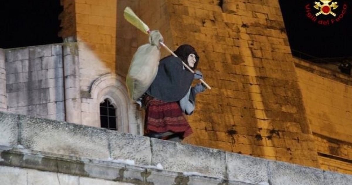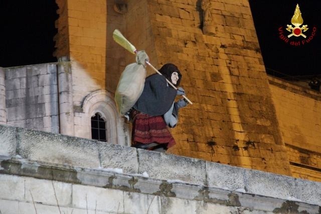 Intorno alle ore 17.00 la “Befana”, in realtà un Vigile esperto in tecniche SAF (Speleo, Alpino, Fluviale) si è calata dal campanile della Chiesa S. Francesco alla Rotonda al centro del piazzale, gremito di bambini con le proprie famiglie.