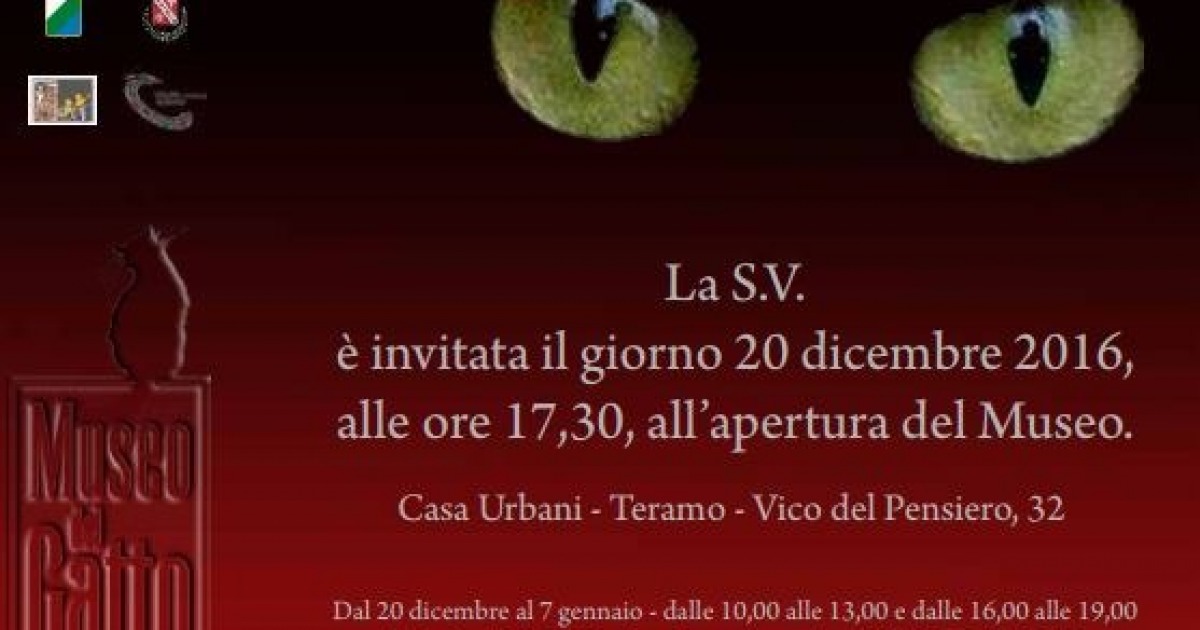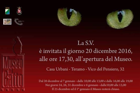 A TERAMO INAUGURA IL MUSEO DEL GATTO. Domani, martedì 20 dicembre, alle ore 17:30 verrà inaugurato il Museo del Gatto, allestito all'interno di Casa Urbani, in via del Pensiero. Si tratta del primo museo d'Italia dedicato ai gatti. Nella mattinata di domani, alle 10:00, il Sindaco di Teramo Maurizio Brucchi e il Presidente dell'IZS, Manola Di Pasquale, incontreranno gli organi di informazione per la preview nel corso della quale sarà presentato il nuovo sito espositivo cittadino.