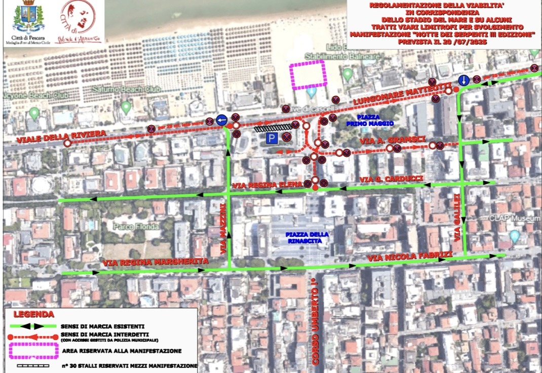 In occasione dell'evento La Notte dei Serpenti, in programma domani alle ore 21 allo Stadio del Mare, la viabilità nella zona di piazza Primo Maggio è stata disciplinata dal Comune di Pescara come segue.