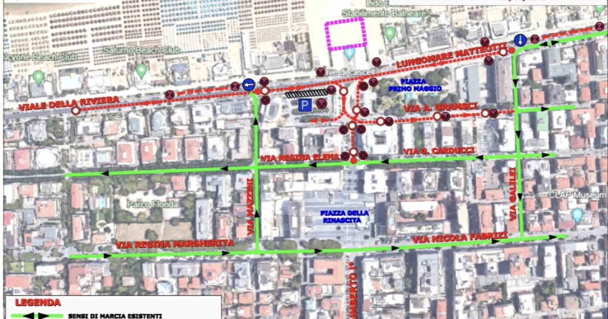 Sono previsti, per la giornata di domani, tra le ore 12 e le 24, e comunque fino a cessate esigenze, il divieto di sosta e il divieto di fermata con rimozione forzata (ad eccezione dei mezzi a supporto della manifestazione, mezzi di soccorso e forze di polizia), sull'intera area a pagamento gestita dalla Società Pescara Multiservice srl sul lato nord di piazza Primo Maggio e su ambo i lati di via Lungomare Matteotti (tratto compreso tra piazza I Maggio e via Galilei, nonché sui 25 metri successivi in direzione sud, lato mare), via della Riviera (tratto compreso tra piazza I Maggio e via Mazzini, nonché sui 25 metri successivi in direzione nord, lato mare), corso Umberto I (tratto compreso tra via Carducci - viale Regina Elena e via Gramsci - piazza Primo Maggio), piazza Primo Maggio, via Gramsci (tratto compreso tra piazza I Maggio e via Galilei).