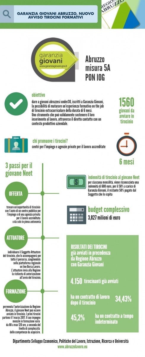 OCCUPAZIONE: NUOVO BANDO PER LA GARANZIA GIOVANI. La Regione Abruzzo prosegue l'attuazione del programma "Garanzia Giovani"e dopo l'attuazione di 4.150 percorsi di formazione già avviati, ripropone un ulteriore bando per 1.560 tirocini extracurriculari della durata di 6 mesi.. Attraverso il tirocinio, che non si configura come rapporto di lavoro, ma rappresenta per i giovani un’esperienza di orientamento al lavoro e di formazione all’interno di contesti produttivi, si cercheranno di dare ai tirocinanti conoscenze e competenze professionali per l’inserimento o reinserimento lavorativo. L'esperienza durerà 6 mesi, con impegno orario mensile variabile dalle 80 alle 120 ore, a seconda del progetto formativo che verrà promosso dai 15 Centri per l’Impiego della Regione e le Agenzie private per il lavoro accreditate. I giovani percepiranno, durante il tirocinio, una somma di 600 euro mensili, pagata per il 50% dalla Regione e per il 50% dal datore di lavoro. Con il presente Avviso la Regione Abruzzo attua la Misura 5.A “Tirocini extracurricolari in ambito regionale” del PAR Abruzzo Garanzia Giovani, come approvato dalla Autorità di Gestione con nota prot. 17203 del 23/11/2016 e dalla Giunta Regionale con DGR n. 847 del 15/12/2016