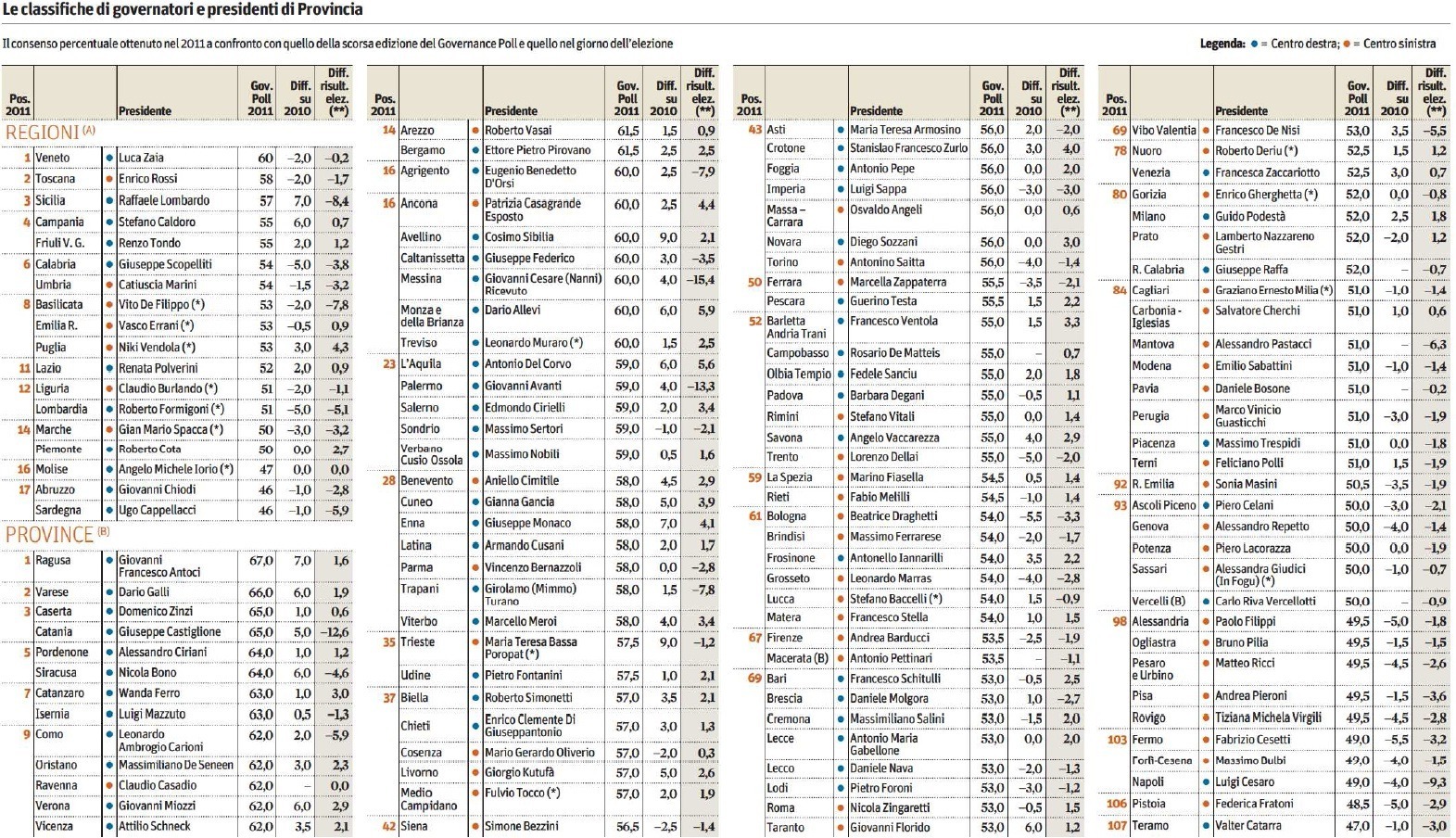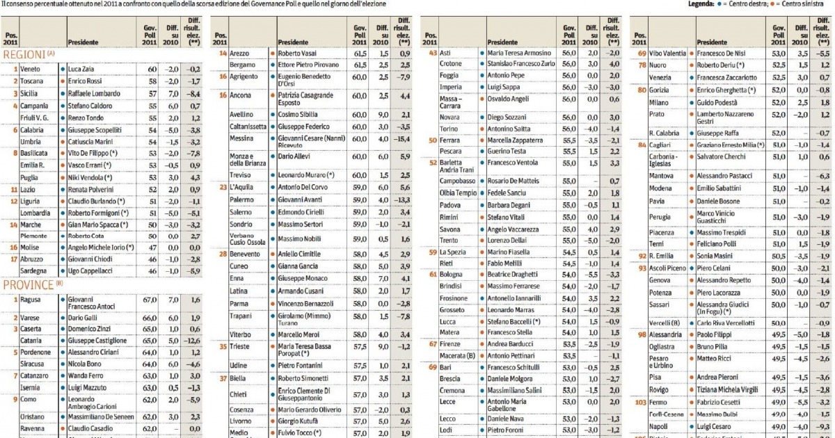 LA CLASSIFICA DEGLI INUTILI - Il Presidente della Provincia di Chieti Enrico Di Giuseppantonio è al 37° posto - nella classifica che riguarda i 107 Presidenti delle Province italiane - del Governance Poll, l’indagine per il Sole 24 Ore pubblicata questa mattina sul quotidiano economico. Il Presidente Di Giuseppantonio nel2011 ha riscosso un gradimento pari al 57%, con un aumento di 3 punti percentuali rispetto al 2010 e una crescita di 1,3 punti rispetto al risultato conseguito nelle elezioni della primavera 2009 quando fu chiamato a guidarela Provincia.