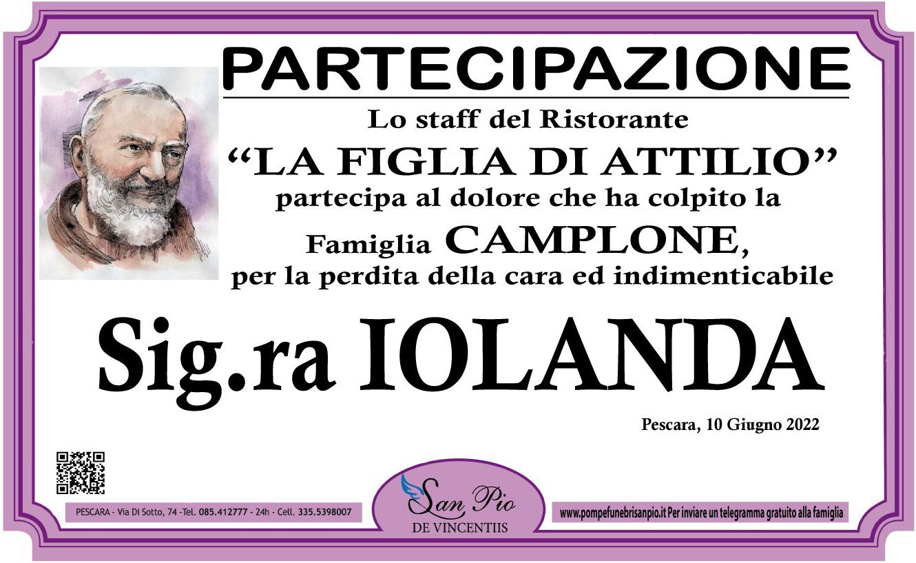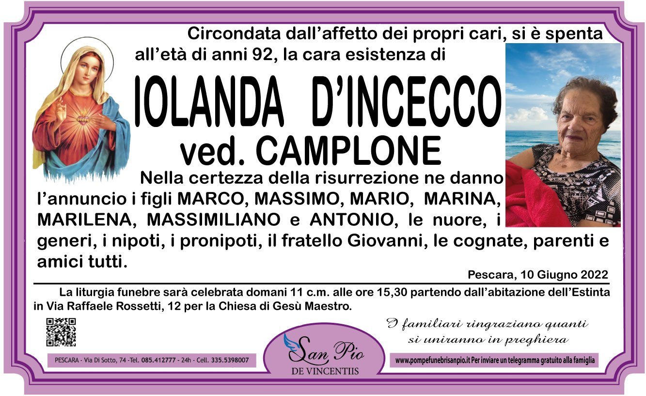 Pescara e la marineria pescarese piangono la scomparsa di Iolanda D'Incecco. Vedova Camplone, 92 anni, era la moglie dell'armatore Erminio, figlio di una storica stirpe di pescatori di Borgo Marino, scomparso nel luglio 2011. La scomparsa è avvenuta nel pomeriggio di oggi, venerdì 10 giugno, nella sua abitazione, dove è stata allestita la camera ardente. La signora Iolanda era molto conosciuta, una presenza fissa e costante lungo la banchina a vendere il pesce che il marito e i suoi figli pescavano. "Un pezzo di storia di Pescara che purtroppo se ne va" dicono chi ha avuto la fortuna di conoscere. "Una donna di altri tempi dedita al lavoro e alla sua famiglia, ora finalmente potrà ricongiungersi all'adorato e amato marito". L'ultimo saluto ci sarà domani, 11 giugno, alle ore 15.30 nella Chiesa di Gesù Maestro. La redazione tutta si unisce al cordoglio dei familiari.