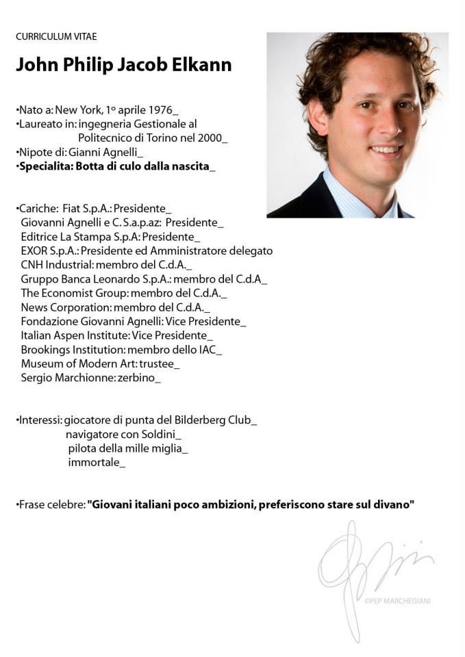 IL CERCA LAVORO JOHN ELKANN. "Molti giovani non colgono le tante possibilità di lavoro che ci sono o perché stanno bene a casa o perché non hanno ambizione. I giovani devono essere più determinati nel trovare lavoro, perché ci sono molte opportunità, spesso colte da altri, proprio perché loro non hanno voglia di coglierle”. Con questa incredibile dichiarazione il rampollo di casa Fiat, John Philip Jacob Elkann, si è rivolto ad una platea di giovani studenti universitari, venerdì scorso a Sondrio.