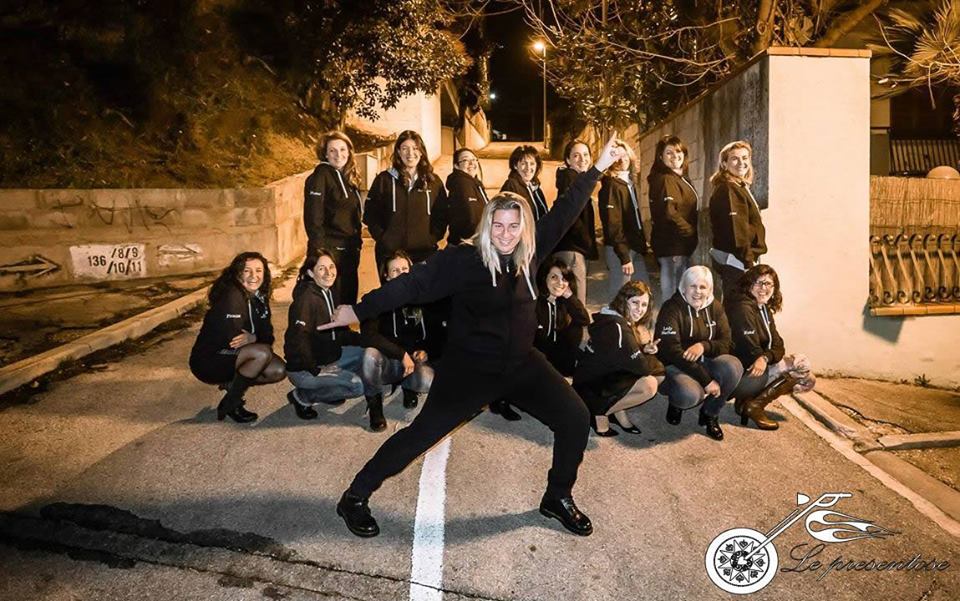 LA MOTOCICLETTA IN ABRUZZO E' FEMMINA. Lady Machete! Aquilotta! Zorro! Attico! Score! Numa! Fabi! Pretty! Asse! Parola! Duchessa! Pinuzza! Gilli! Val! Dottora! Ilaria! Nanà! Sbirra! Sembrano i soprannomi delle componenti di una banda criminale, invece sono i nick-name di un gruppo di motocicliste abruzzesi: “Le Presentose d’Abruzzo”, primo team al femminile, nato dalla condivisione di una passione prepotente, la moto! A gettare le basi del progetto “Presentose” furono le prime del gruppo nella notte del 22 marzo 2014, dopo aver assistito ad un concerto di Loredana Berté, galvanizzate dall’energia trascinante della “Mamma Rock” della musica italiana. Il giorno successivo a quella magica serata, le ragazze si mettono d’impegno ad inventare un logo e un nome per il loro team. Nasce così il loro marchio: disegno minimal di una moto con, al posto di una normale ruota, una Presentosa stilizzata. La Presentosa è il gioiello per eccellenza della tradizione orafa abruzzese e la circolarità della sua forma è perfetta per richiamare il cerchione e l’amore per la propria terra che anima le nostre centaure. In principio erano appena sei motocicliste, ma in poco tempo, grazie all’account Facebook “Le Presentose d’Abruzzo”, al potere aggregante della moto e, soprattutto, in virtù dell’energia e della sinergia che si instaurano tra queste motocicliste, si aggiungono altre tredici donne.