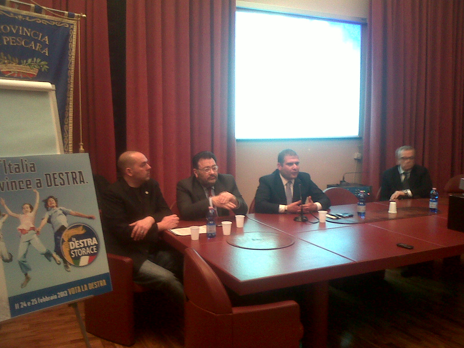 ABRUZZO. LA LISTA, LA DESTRA. Questa mattina il segretario regionale del partito di Storace, Luigi D'Eramo, ha presentato la i nomi dei candidati alla Camera dei Deputati ed al Senato della Repubblica de "La Destra" alle prossime elezioni politiche del 24 e 25 febbraio. A presiedere alla conferenza stampa anche l'assessore regionale ai trasporti Giandonato Morra e il segretario provinciale pescarese Alessandro Baldati. «Siamo il secondo partito della coalizione di centrodestra - hanno dichiatato D'Eramo e Morra - e abbiamo la reale opportunità di rappresentare, con la garanzia della nostra storia, l'Abruzzo nei due rami del parlamento». Non è mancata una stoccata "velenosissima" all'ex alleato Gianfranco Fini. «E'- afferma D'Eramo - il più grande traditore della storia». Durante i lavori di presentazione della "squadra" è passato il "padrone di casa" Guerino Testa, nel senso che la conferenza si è tenuta in provincia a Pescara, a chiedere il pagamento della sala. Tariffa economica: 100 euro per un paio d'ore.