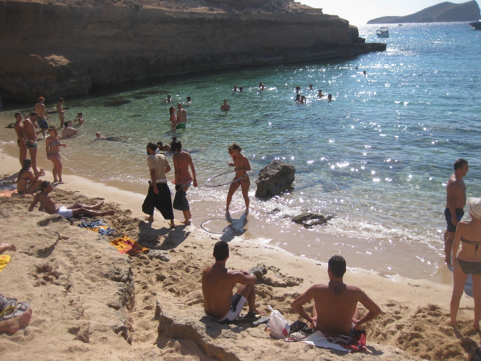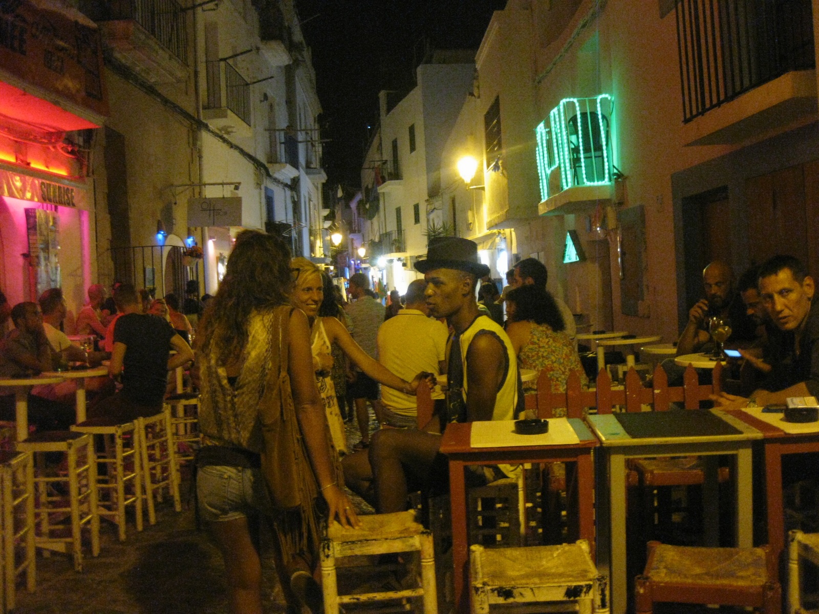LUNEDI' LA CONFUSIONE: SPACE O PACHA? Da cronisti d'assalto avevamo preso contatti coi responsabili delle famose discoteche de la Isla Blanca (Amnesia, Pacha, Space, DC10 e Ushuaia), vero volano dell'economia locale, con fatturati da capogiro, paragonabili a quelli di multinazionali. Stanchissimi dalla stupenda giornata di mare ci vestiamo, brandizzati con le t-shirt Youness del nostro amico Christian Iacobucci in direzione di una di esse. Ma a Platja d'En Bossa comincia l'incubo. Tra posti di blocco e traffico individuiamo il parcheggio dello Space. Intorno a noi, in fila, "mostri" malvestiti, puzzolenti e bruttissimi a spasso senza guinzaglio ne' catene. Alla cassa dello Space scopriamo che eravamo in lista da un'altra parte: al Pacha. Così decidiamo di mollare tutto e rimandare al domani o ad altrove la nostra noche, come dicono qui, a "toda pastilla" (è solo un modo di dire!). Scelta giustissima e di cui non ci siamo mai pentiti: avevamo appena trascorso, tutto il giorno , tramonto compreso, in un posto perfetto - Cala Comtesita è una caletta vicino la più turistica spiaggia di Cala Comte -, cioè uno spettacolo della natura di cui parleremo meglio dopo. Stelle e cielo, come lo Zeus dello Spasso, ci perdonarono quella notte, spero che lo facciano anche gli integralisti dello ZUBar se non siamo andati lunedì al DC10.