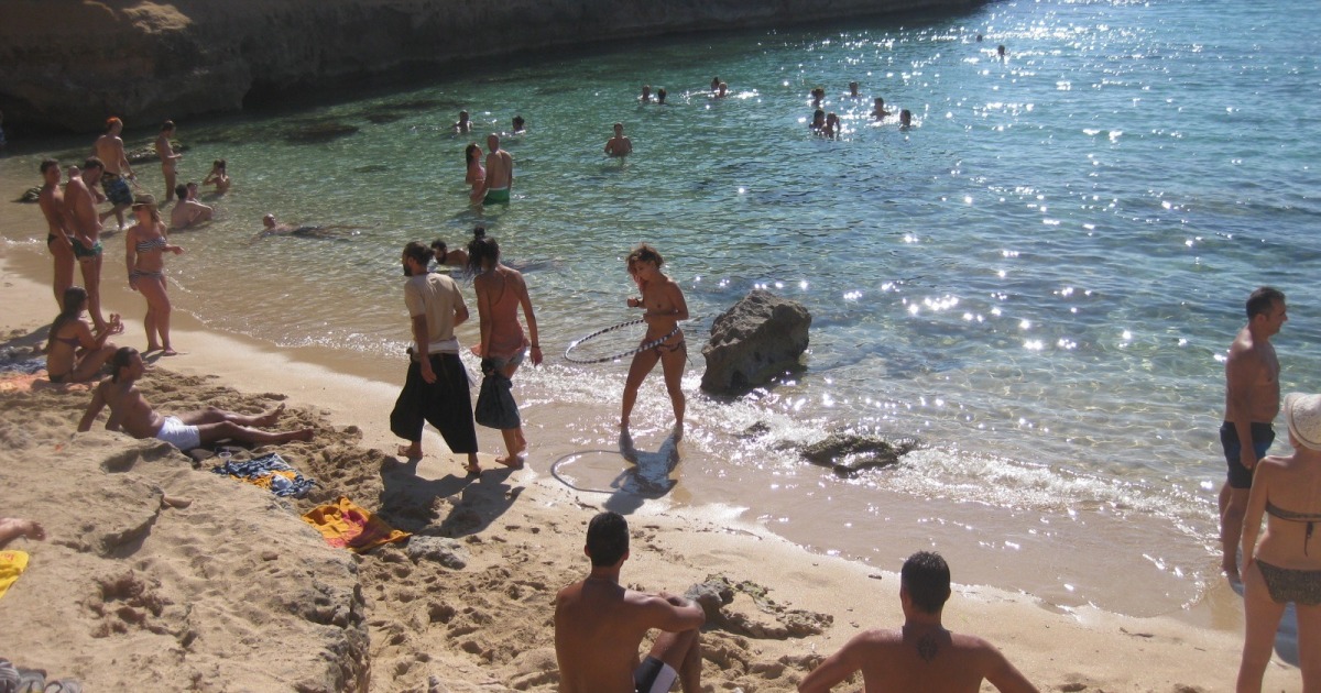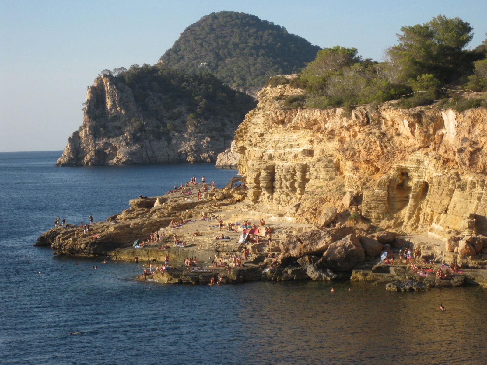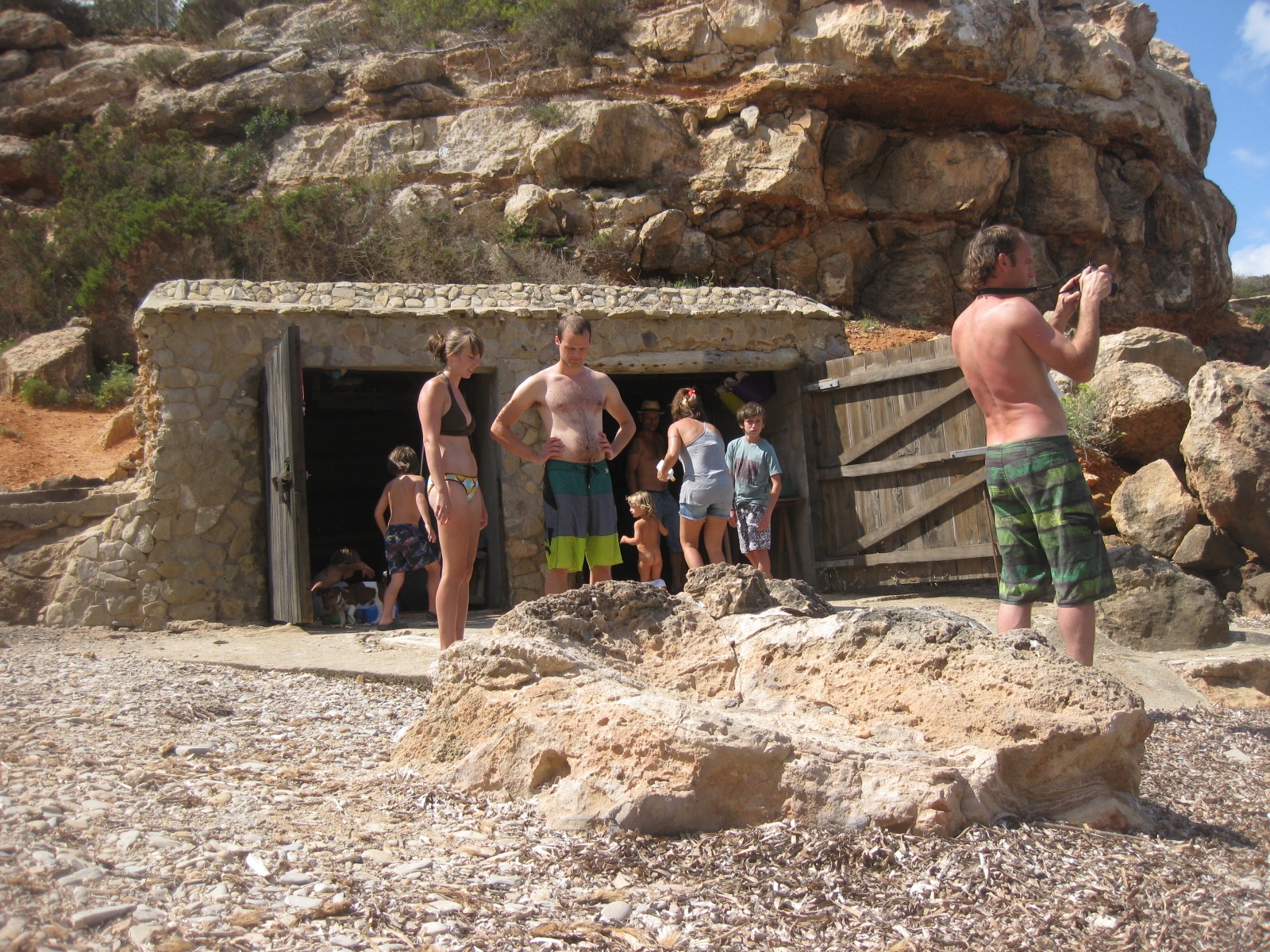 SONNO E RISVEGLIO A CALA DE PUNTA GALERA. Troviamo la nostra struttura a notte fonda. Stanchi dal viaggio, indispettiti dal nostro alloggio - che pensavamo diverso - ma ci addormentiamo. La mattina, al risveglio, cambia però tutta la prospettiva. Siamo a venti metri dal mare, c'è un sole caldo ed il clima delizioso cancella il brutto ricordo dello sbarco nell'isola di Spagna, terra mitica, che mai fino ad oggi ha deluso una nostra gita. Doccia, colazione veloce, borsa frigo accuratamente preparata e via alla ricerca della caletta suggeritaci dal solito amico, quello della "sola" del sito rent a car. Ma una volta a Cala de Punta Galera, gioiello della natura incastonato tra rocce scolpite dal vento ed acque turchesi oltre che meta amatissima del naturista in cerca del nirvana, gli perdoniamo tutto. Facciamo amicizia con una meravigliosa famiglia spagnola, numerosissima, compasta da tre coppie con una morra di figli al seguito. Erano i discendenti delle case di pescatori che s'affacciavano su quello spettacolo della natura. Aspettiamo il tramonto. Tutto perfetto. Dopo una veloce doccia decidiamo di dare "una vuelta" ad Ibiza Vecchia, dall'altra parte. Beviamo gazpacho e ceniamo a "El Patio", localino tipico ibizenco che ci sfamerà anche il giorno successivo.