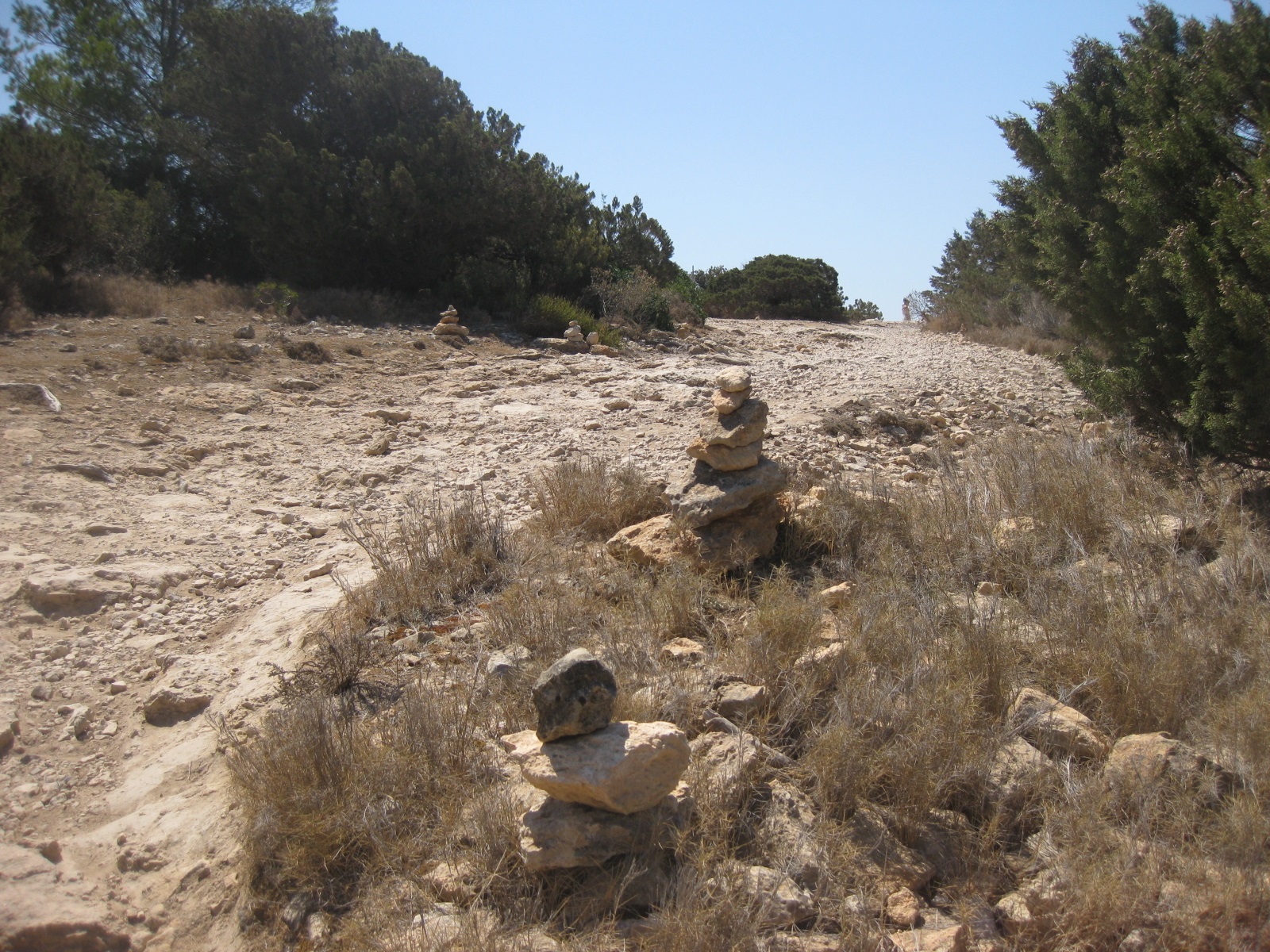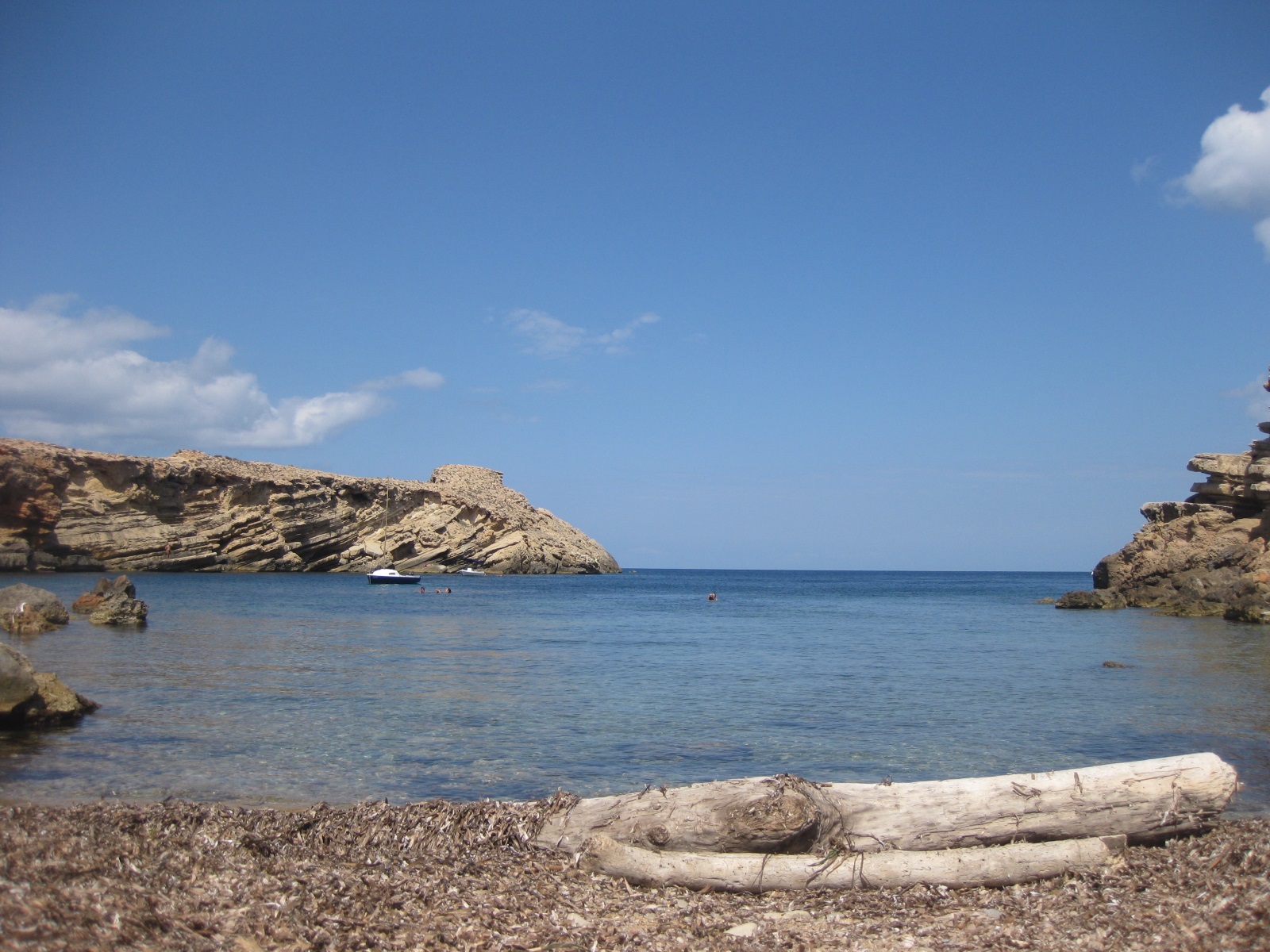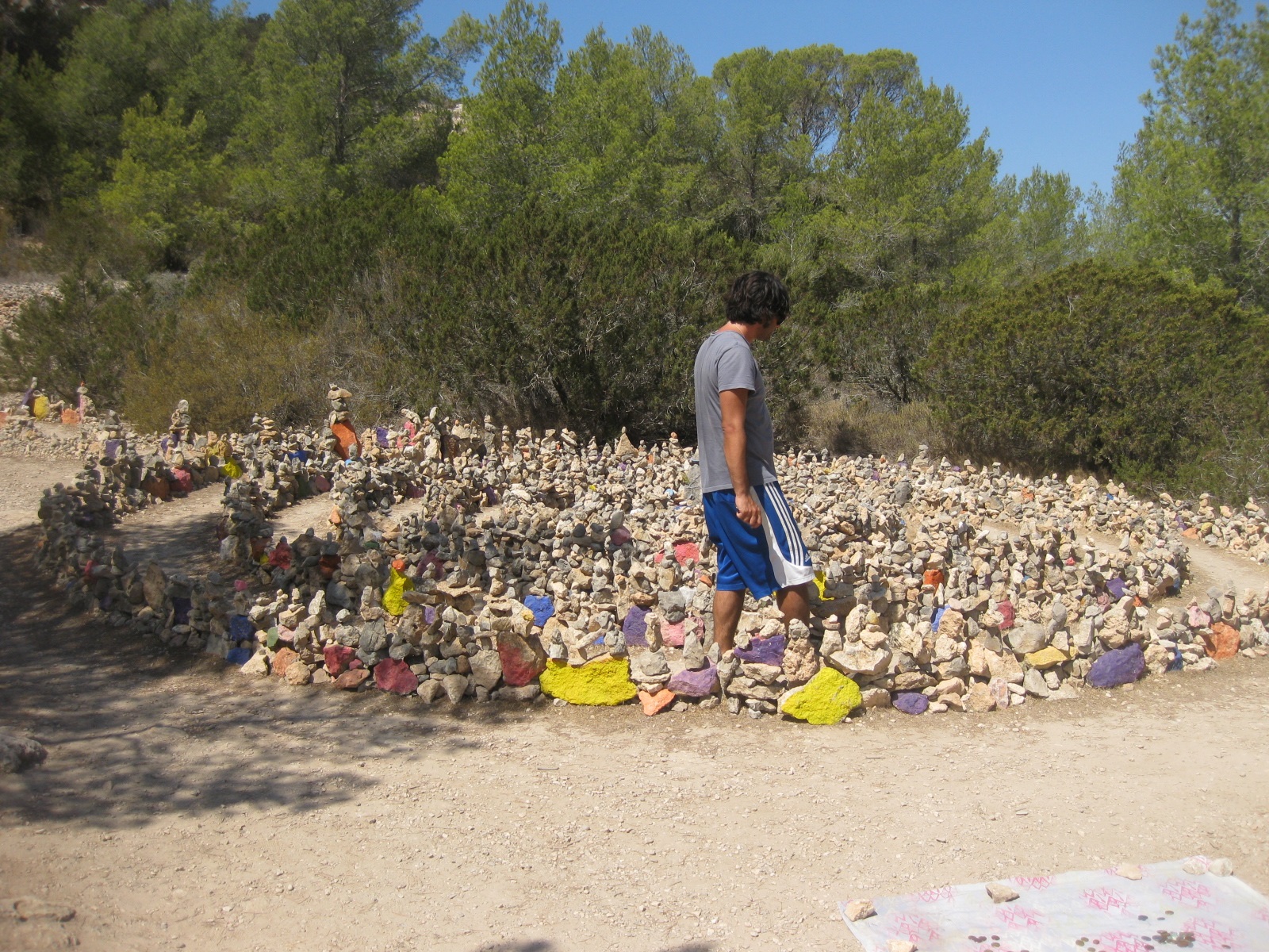 MERCOLEDI LA SCOPERTA AD ATLANTIS. L'avventura, noi di Abruzzo Independent, ce l'abbiamo nel sangue così decidiamo di andare alla scoperta di Atlantis, uno dei luoghi più misteriosi dell'isola. Questo “non posto” non è né una spiaggia né una caletta, bensì una scogliera a picco sul mare, di fronte a Es Vedrà. Ci si accede dopo un percorso faticosissimo ma una volta lì, capisci che ne è valsa la pena. Sulle rocce, dentro una caverna, ci vive un uomo, un hippy, da circa vent'anni ed è lui che ha reso quel posto magnifico ed allo stesso tempo "sacro", realizzandovi una Spirale dell'Anima ed il Tempio di Shiva - che pare porti fortuna; noi abbiamo lasciato un piccolo dono - oltre ad una costellazione di torrette di roccia e simboli della pace che ben lasciano presagire. Nelle acque il mio secondo incontro sottomarino con un polipo azzurro. Il primo era avvenuto domenica a Cala de Punta Galera ed avevo povato pena per quell'animale bellissimo, nero, catturato dalla famigliola spagnola ma, per fortuna, rilasciato grazie ai pianti dei bimbi ed alle suppliche delle chicas.