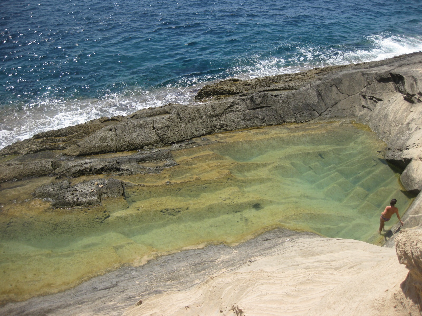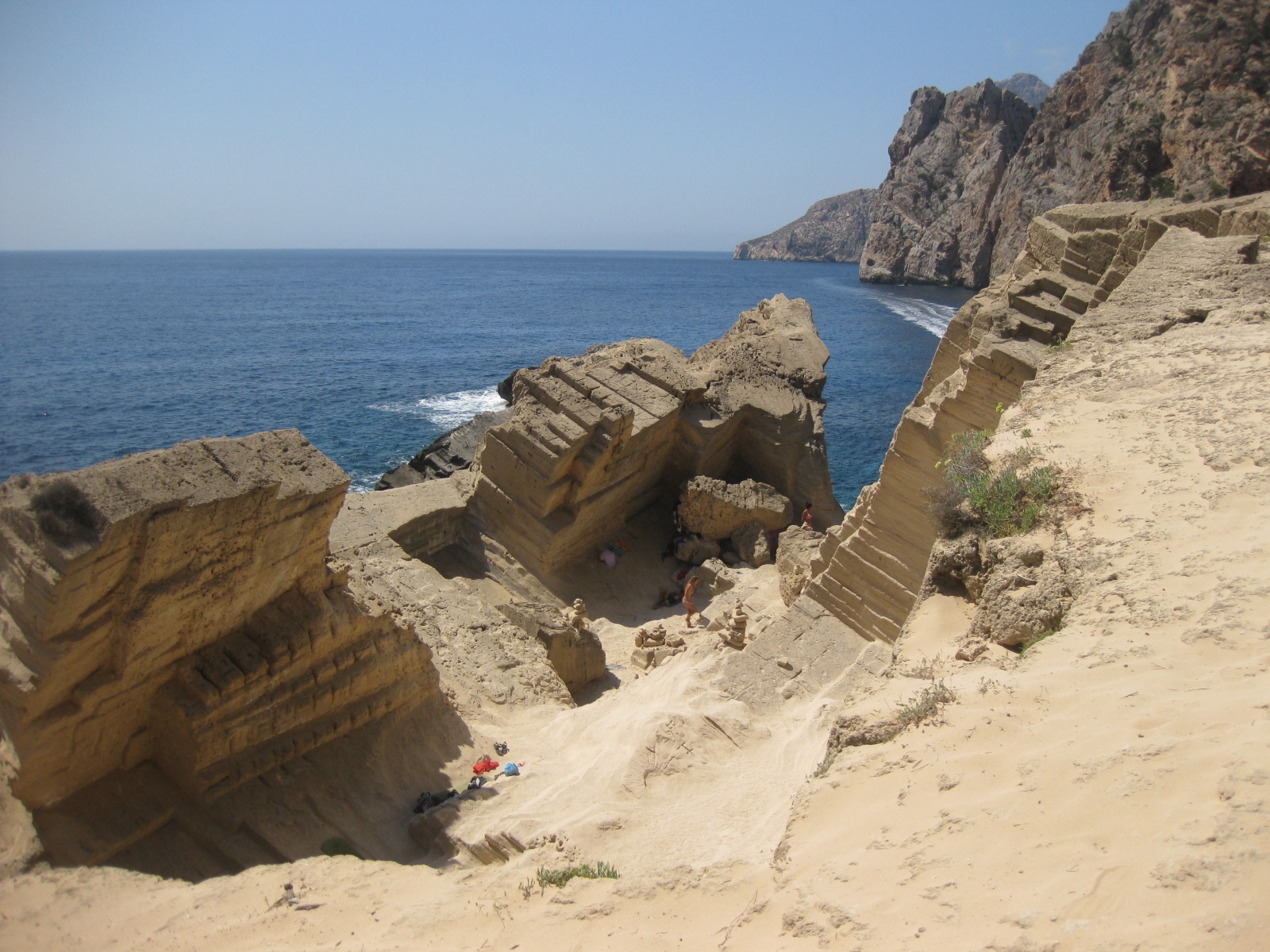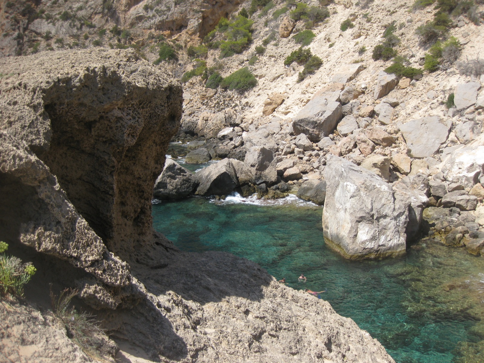 MERCOLEDI LA SCOPERTA AD ATLANTIS. L'avventura, noi di Abruzzo Independent, ce l'abbiamo nel sangue così decidiamo di andare alla scoperta di Atlantis, uno dei luoghi più misteriosi dell'isola. Questo “non posto” non è né una spiaggia né una caletta, bensì una scogliera a picco sul mare, di fronte a Es Vedrà. Ci si accede dopo un percorso faticosissimo ma una volta lì, capisci che ne è valsa la pena. Sulle rocce, dentro una caverna, ci vive un uomo, un hippy, da circa vent'anni ed è lui che ha reso quel posto magnifico ed allo stesso tempo "sacro", realizzandovi una Spirale dell'Anima ed il Tempio di Shiva - che pare porti fortuna; noi abbiamo lasciato un piccolo dono - oltre ad una costellazione di torrette di roccia e simboli della pace che ben lasciano presagire. Nelle acque il mio secondo incontro sottomarino con un polipo azzurro. Il primo era avvenuto domenica a Cala de Punta Galera ed avevo povato pena per quell'animale bellissimo, nero, catturato dalla famigliola spagnola ma, per fortuna, rilasciato grazie ai pianti dei bimbi ed alle suppliche delle chicas.