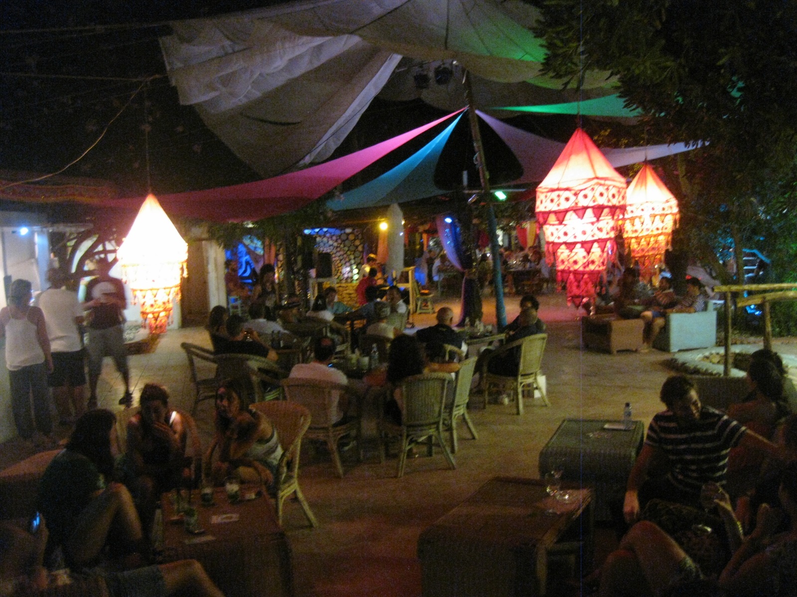 MARTEDI NATURISTA E HIPPY STYLE. Leggendo, scopriamo che la zona hippy di Ibiza, quella che ci interessava di più, era nella zona Nord Nord-Est dell'isola. Così raggiungiamo la spiagga di Aigues Blanques, mecca del naturista "à la page". Per esperienza già sapevamo che le zone frequentate da loro sono quelle più belle e selvagge. Dopo ore di relax, quasi in solitudine, optiamo per un aperi-cena nel delizioso ristorante di Anita, a San Raphael, famoso perchè riceve la posta delle centinaia di hippies che vivono sull'isola. Buonissimo il filete de bacalao ed i camarones a la plancha affogati da un rosato ghiacciato, beverino e malizioso, della cantina Vinasol. Proseguiamo, dopocena, verso Las Dalias dove dal 1954 si svolge il mercatino hippy più bello di tutta l'isola. Le ore trascorrono piacevoli in quell'atmosfera rilassata e odorosa di incensi (e altro). In questo posto hanno suonato personaggi del calibro di Syd Barrett, Bob Marley, John Lennon e Jimy Page tanto per fare due nomi. Fatte alcune spese, la giornata si conclude in maniera dolcissima.