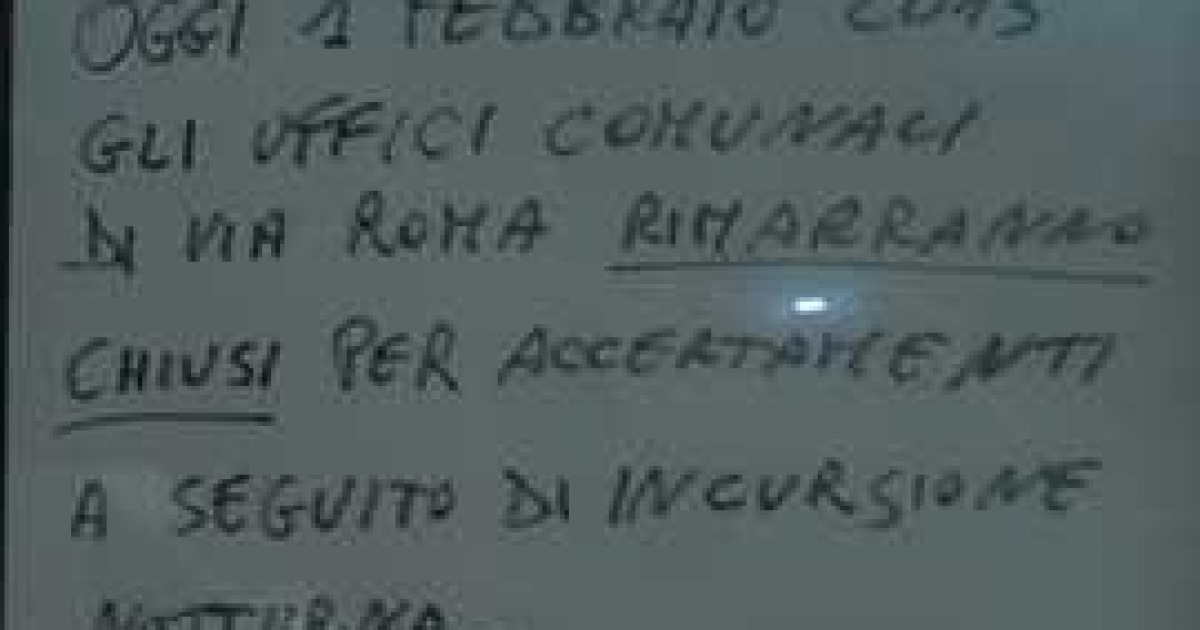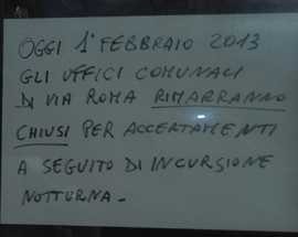 INDAGANO I CARABINIERI. Sulla vicenda stanno indagando i carabinieri di L'Aquila che stanno eseguendo i rilievi del caso. Per queste ragioni gli Uffici Comunali di via Roma n. 207/A resteranno chiusi al pubblico per l’intera giornata. Per quanto riguarda i Servizi Demografici, fino alle ore 12.00 sono aperte le delegazioni di Arischia, Roio, Sassa, Preturo, Camarda, Paganica e Bagno