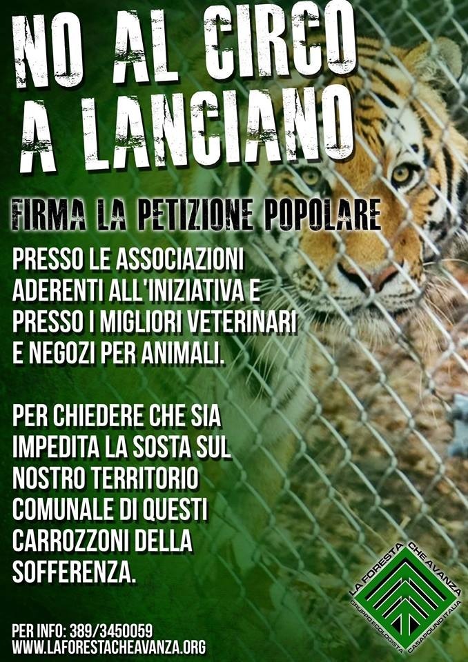 “La raccolta firme, - continua Barone- che vedrà coinvolte anche altre associazioni (tra le quali spicca la "Di Monte - GAP Studio") attive sul territorio, sarà effettuata presso la nostra sede di Via Cavour 1 negli orari di apertura, le associazioni aderenti, i veterinari e presso i negozi per animali di Lanciano. Così sarà possibile ottenere anche per la nostra città una delibera che ne tenga lontani questi ‘baracconi ambulanti della sofferenza’, come già deliberato in molte altre città in tutta Italia”.