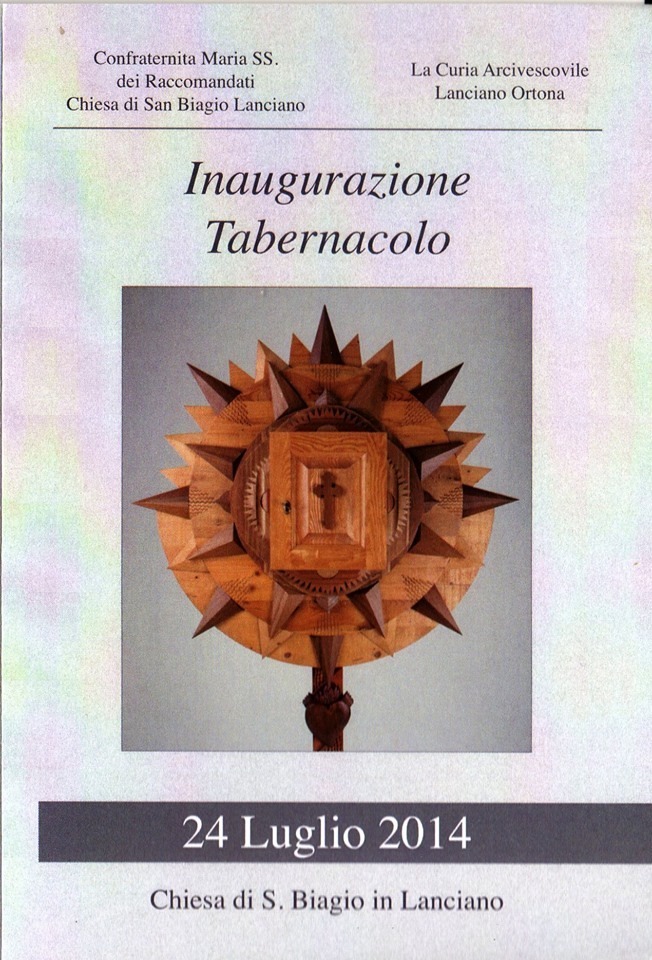 La Confraternita Maria SS. dei Raccomandati e la Curia Arcivescovile di Lanciano-Ortona, giovedì 24 luglio, invitano la cittadinanza alla presentazione e benedizione del nuovo tabernacolo di San Biagio, opera realizzata dal Maestro Paolo Spoltore. Per l’occasione alle ore 18 verrà celebrata una Santa Messa, officiata da Monsignor Emidio Cipollone, Arcivescovo della diocesi di Lanciano-Ortona.