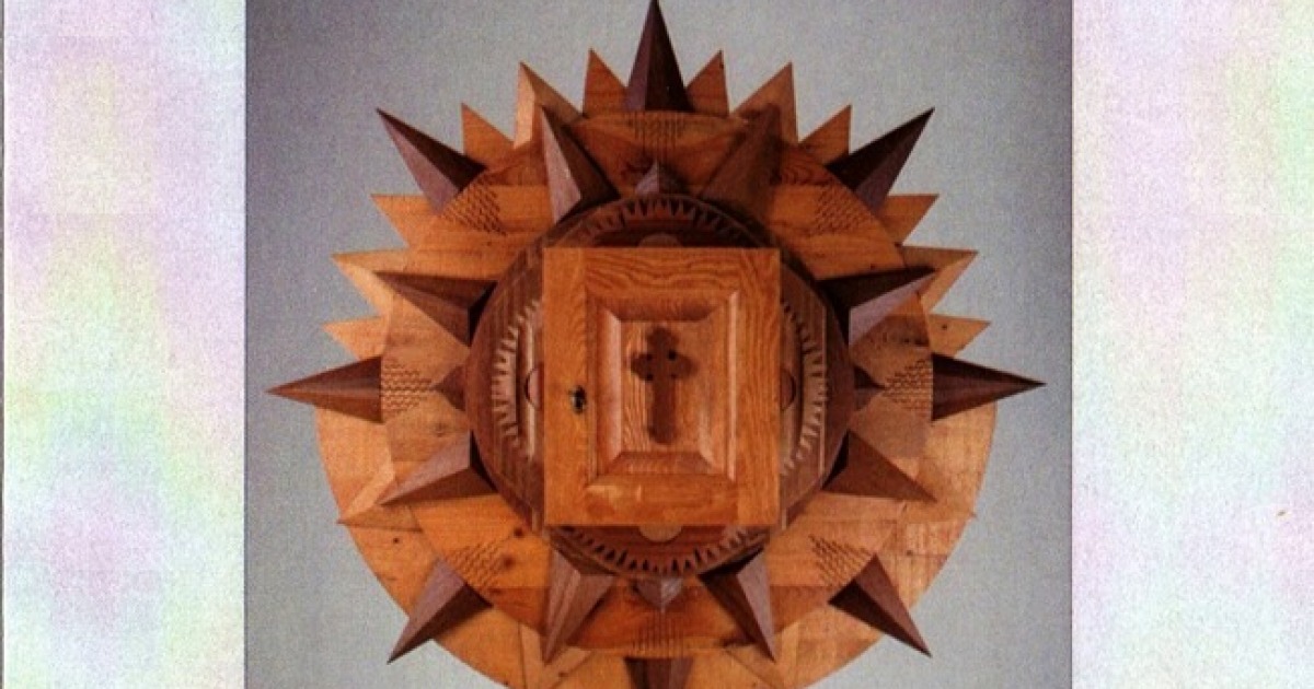 L’opera, infatti, interamente costruita in legno massello policromo assume un particolare sviluppo verticale, partendo da una base quadrata e tramite un asse verticale si conclude con una forma a raggiera dove viene conservata l’Ostia consacrata.