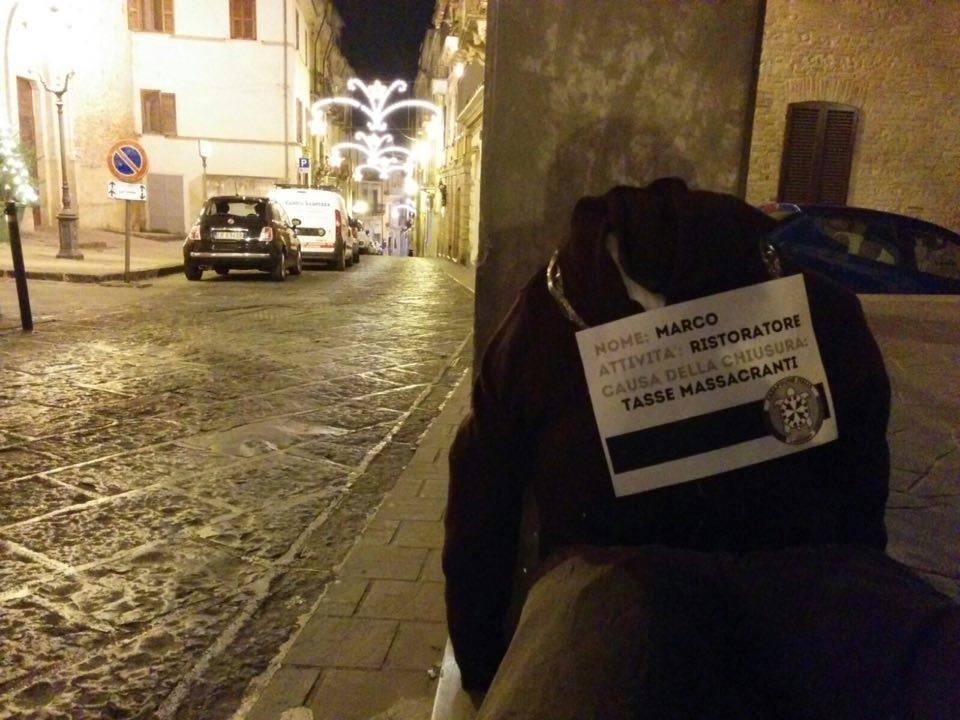 LA PROTESTA. Manichini di negozianti che chiedono l’elemosina posti in vari punti della città. E’ questa la protesta messa in atto da CasaPound Italia per segnalare la situazione di estremo disagio che i titolari di attività economiche cittadine si trovano a vivere, dopo che l’ennesimo locale si è trovato a dover chiudere per l’eccessiva pressione fiscale.